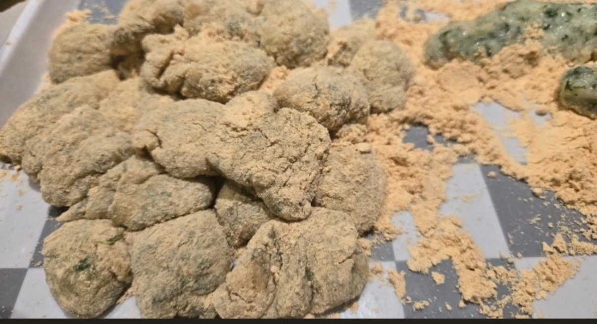 엄마는 떡 반죽을 하고, 콩가루를 무친 뒤, 손으로 조금씩 떼어내 바닥에 내려놓았다.