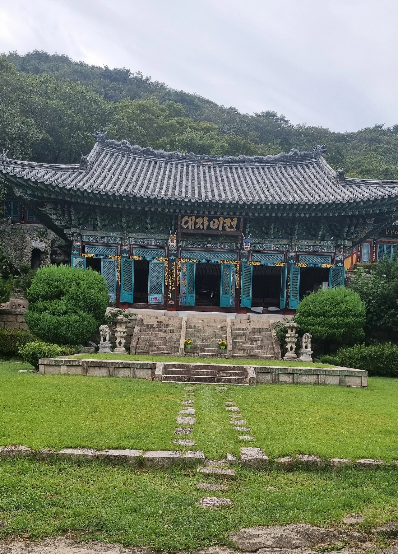 나는 발걸음을 옮겨 위쪽에 있는 금강암으로 향하였다. 이곳을 가려면 계단이 아닌 여러 개의 바위를 지나가야 했는데 여러 날동안 내린 비로 바윗틈에 폭포수 같은 물이 계곡사이로 흐르고 있었다. 숲이 우거진 그늘 속을 천천히 건다 보니 교회와 성당이 지어진 평지와 달리 절이 산속에 있는 것은 계단을 걷고 산을 오르면서 속세의 번뇌와 욕심을 비우라는 의미가 아닌가 잠깐 생각을 해보았는데 땀이 날 정도의 가파른 길을 오르다 보니 시원한 초록색 잔디가 깔린 금강암이 나타났다. 사찰 마당에는 개 세 마리가 잔디에 누워 낮잠을 자고 있었는데 낯선 이를 경계하였는지 으르렁거리며 당장 달려올 듯이 하자 마루에 앉아 계시던 스님 한분이 제지하여 나는 편안하게 경내를 둘러볼 수 있었다.