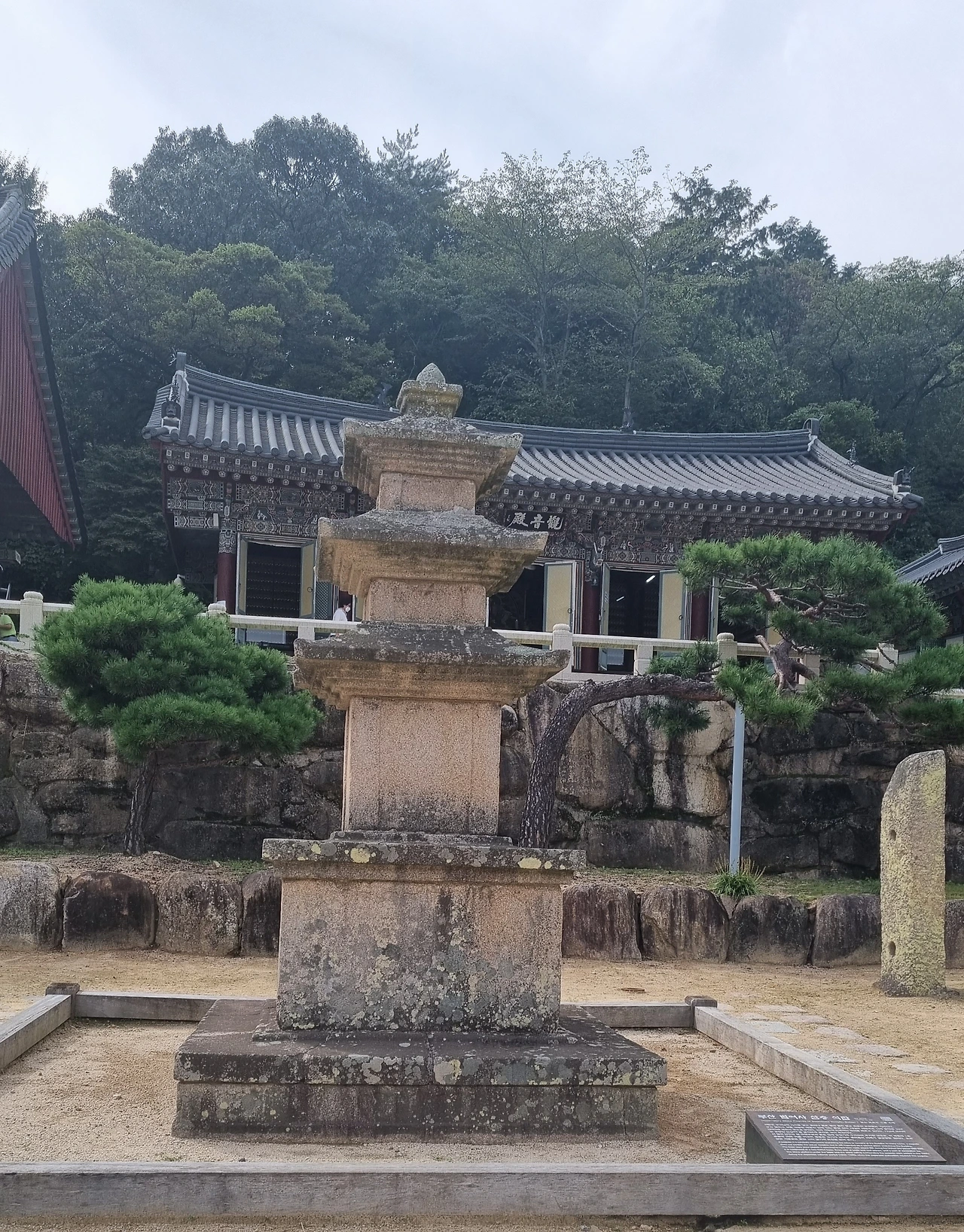 배를 든든히 채운 나는 왔던 길을 돌아오며 절 입구에서 표를 검표하는 매표원에서 미리 끊은 표를 보여주고 빈자리를 찾아 주차장에 차를 주차하였다. 금빛나는 물고기가 하늘에서 내려와 우물에서 놀았다고 해서 지은 이름인 금정산에 범어사가 있었는데 영남의 3대 사찰 중 하나로써 전국 사찰 중 유일하게 삼국유사를 소장하고 있다고 들었다. 주차장에서 대웅전까지 가려면 3개의 문을 통과해야 하였는데 일주문을 지나 돌계단을 하나씩 오르다 보니 천왕문이 나오고 다음에 불이문을 지나니 넓은 대웅전 앞마당이 나타났다. 마당을 가로질러 대웅전 안을 살펴보니 이 사찰의 보물인 목조석가여래삼존좌상이 밖을 향하여 좌정하고 있었는데 대웅전을 중심으로 오른편에는 삼성각, 왼편에는 팔상 독전 나한전이 나란히 위치해 있었다. 대웅전 계단을 내려오며 경내를 살펴보니 마당 한편에 통일신라시대 흥덕왕 때 건축되었다는 3층 석탑이 자리하고 있었는데 유명한 사찰이라 그런지 드문드문 가족단위의 사람들과 중국인 관광객들이 사진을 찍고 있었다.