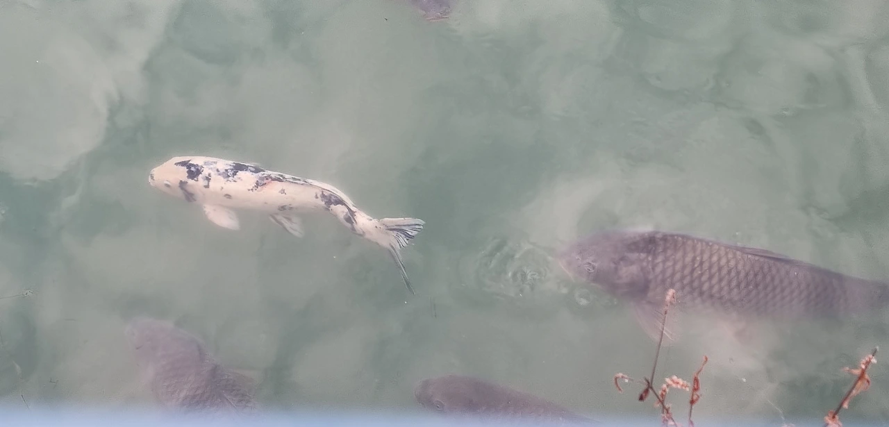 시작한 하늘은 파란 하늘이 구름사이로 얼굴을 내미는데 얼굴이 작은 미국인으로 보이는 그녀는 물속을 헤엄쳐 다니는 잉어 떼를 보며 휴대폰을 꺼내어 사진을 찍고 다시 몇