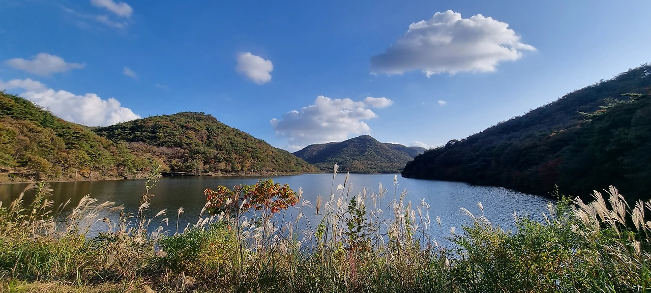 인공폭포를 보고 나서 그 옆에 난 길을 따라우리는 등산을 하듯이 걸었다. 조금 걷자 산중턱에는 나무로 둘러싼 요새 같은 저수지가 나타났는데 뭉게구름이 뜬 하늘과붉은 입술 같은 백일홍 그리고 바람에 흔들리는 갈대의 절경을 눈에 담으며 나는 가을이 무르익는구나 생각을 하였다.