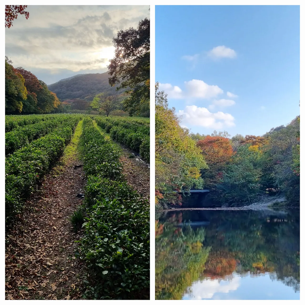 풍경인지 사람인지 사진을 찍는 사람도 한 폭의 아름다운 그림이 되었다. 그것을 보며 걷다 보니극락교에서 멀지 않은 넓은 평지가 나타났는데 고랑을 지은밭에는 녹차잎이푸르러 나는 다시 휴대폰을 꺼내 들며 그것을 향하여 셔터를 눌렀다.