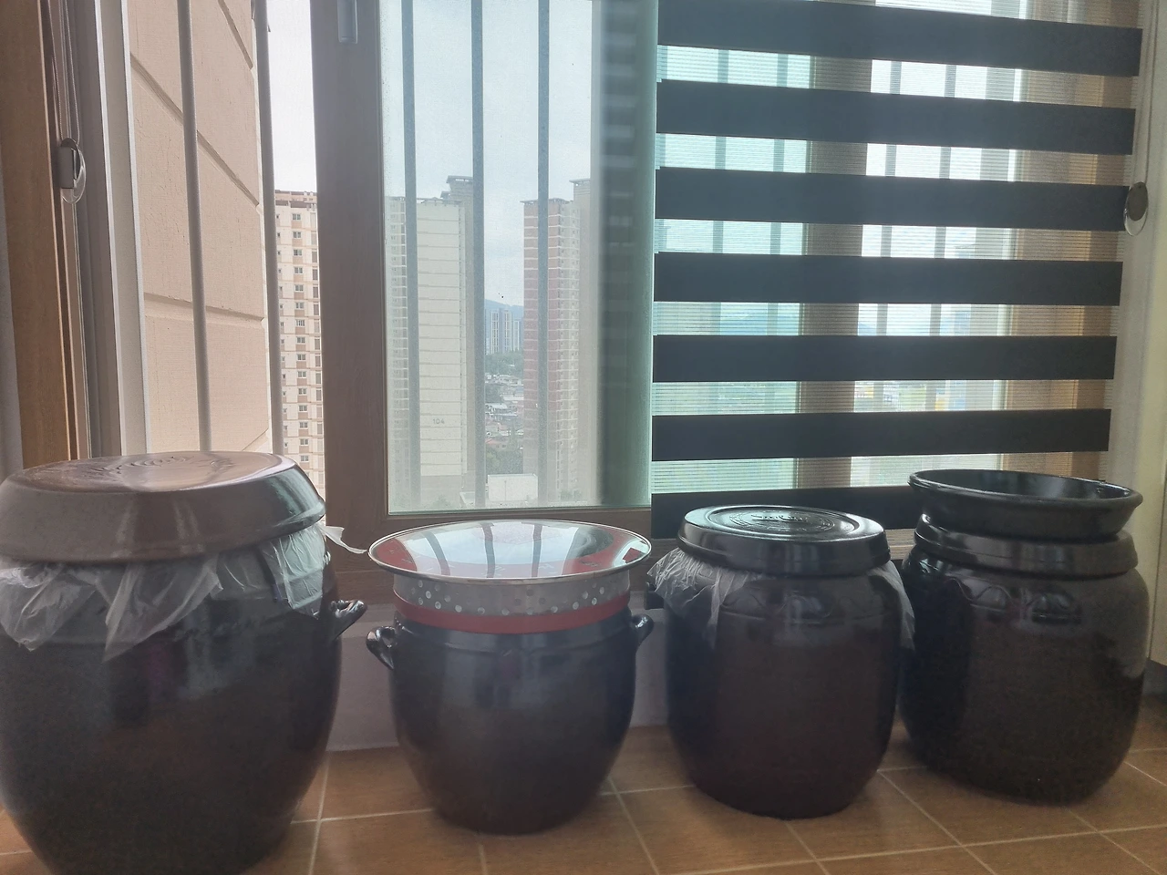 베란다에서 햇볕과 바람을 맞으며 된장 간장 고추장이 형제처럼 얼굴을 맞대며 익어갈 때
