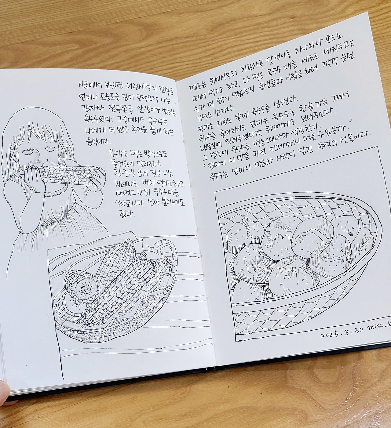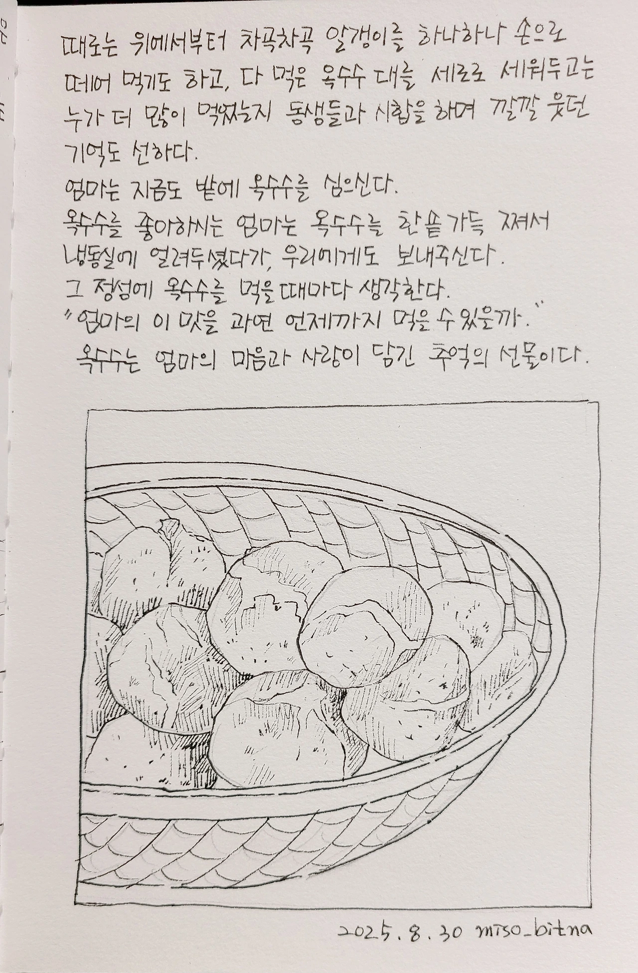 지금도 가끔 지하철 역사에서 파는 찐 옥수수를 보면 발걸음을 멈추게 된다. 삼천 원에 두 개씩 사 와서 혼자 앉아 먹다 보면, 어느새 그때의 부엌 풍경과 엄마의 얼굴이 떠오른다. 몇 달 전 시골에 갔을 때도 엄마는 삶아둔 옥수수를 소분해 봉지에 담아 내게 챙겨주셨다. 냉동실에서 하나씩 꺼내 쪄 먹을 때마다 여전히 그 맛은 여름의 기억을 깨워주었다. 하지만 다 먹고 나면, 또 그립다. 엄마가 좋아하시던 옥수수, 그리고 그 옥수수를 함께 나누던 시간이.