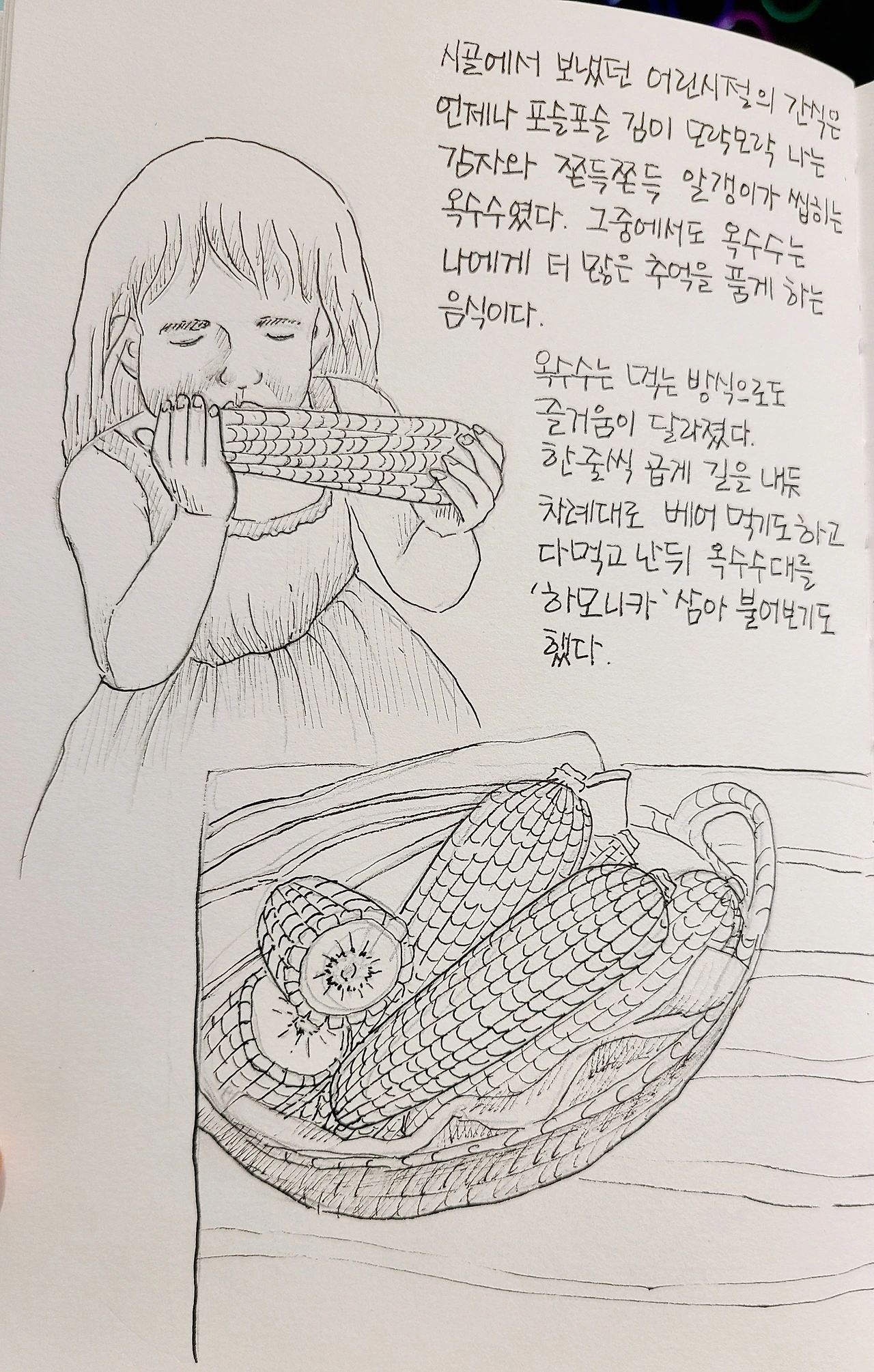 그리고 여름 간식의 왕이라 할 수 있는 옥수수. 엄마가 정성껏 기른 옥수수를 큰 솥에 삶아 한 솥구리 가득 담아놓으면, 그 안에 있던 옥수수는 금세 사라지곤 했다. 알갱이를 입으로 한 줄씩 베어 먹기도 하고, 손으로 하나하나 떼어먹기도 하며, 먹는 방법 속에서도 아이들만의 놀이와 웃음이 있었다. 때로는 알갱이를 가지런히 한 줄로 따먹기도 하고, 위에서부터 차례대로 베어 내려오기도 했다. 그렇게 먹는 즐거움은 여름의 가장 큰 행복 중 하나였다. 알갱이가 쫀득쫀득 씹히는 맛은 단순한 포만감 이상의 기쁨을 주었고, 온 가족이 둘러앉아 옥수수를 나누던 그 시간은 우리만의 여름 축제였다.