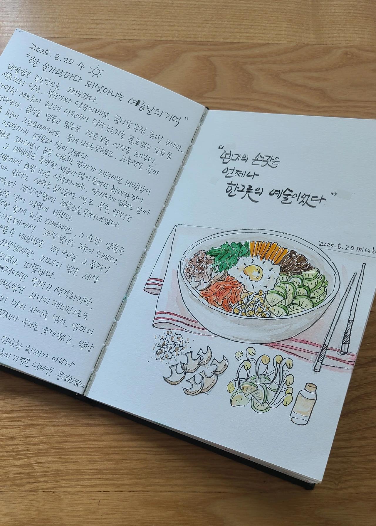 여름날의 밥상은 여전히 내 마음속에서 가장 따뜻한 풍경으로 남아 있다. 비빔밥을 비비던 소리, 감자의 포슬포슬한 향, 옥수수 알갱이를 씹으며 나누던 웃음, 시원한 콩국수의 고소한 맛. 그 모든 것들은 결국 엄마의 손맛이 만들어낸 추억이었다. 오늘도 그리움이 깊어지는 여름날, 나는 그 밥상 위에서 여전히 엄마를 만난다.