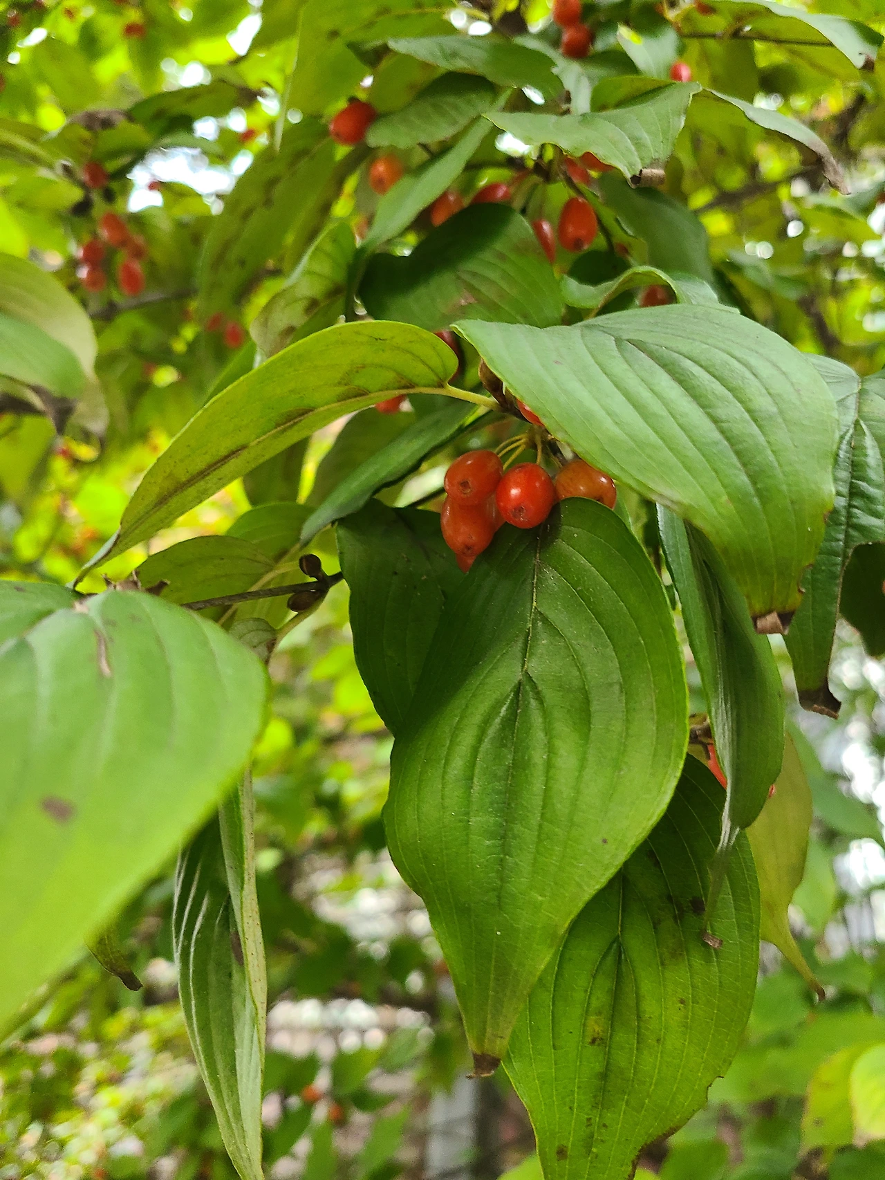 산수유의 구슬 같은 열매가 매달린 담장 옆을 지나며.
