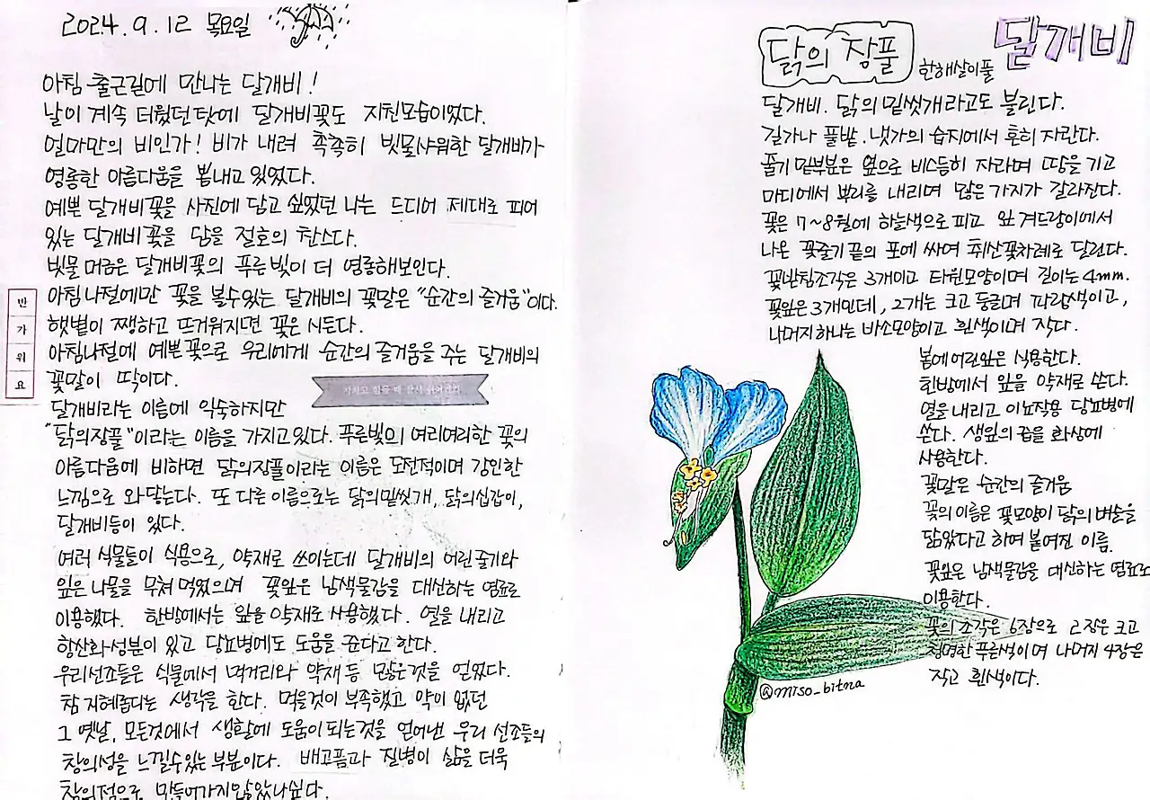 바쁜 출근길, 골목 한 귀퉁이에서 만난 작은 달개비꽃. 그 짧고 푸른빛이 오늘의 나에게 말을 건넨다. 길고 화려하지 않아도 좋다. 네가 피어난 그 순간만큼은, 그리고 네가 누군가에게 필요한 존재가 되는 그 순간만큼은, 온전히 너의 빛을 내어주라고. 나는 오늘, '눈에 띄지 않아도, 어떤 삶에는 꼭 필요한 존재가 된다.'는 교훈과 함께 하루를 시작한다.