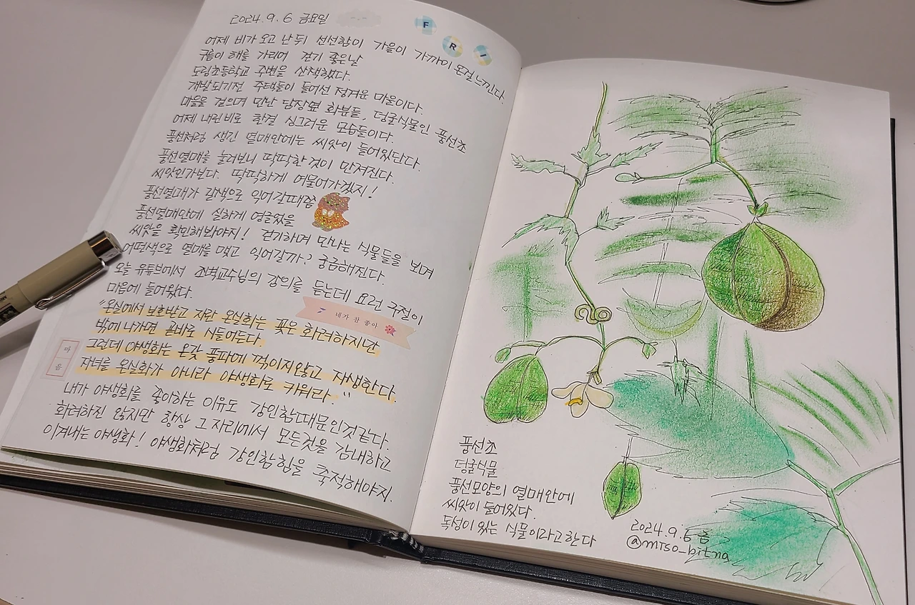 나와 나의 아이들이 이 험한 세상을 살아가면서, 꺾이지 않고 당당하게 뿌리를 내릴 수 있기를 바란다. 온실 속에서 안락하게 보호받기보다, 때로는 비바람을 맞고 햇볕 아래 단단하게 여무는 풍선초의 씨앗처럼. 나 역시 야생화의 강인함을 닮고 싶다. 무더위 속에서도 굳건히 피어나는 야생화처럼.
