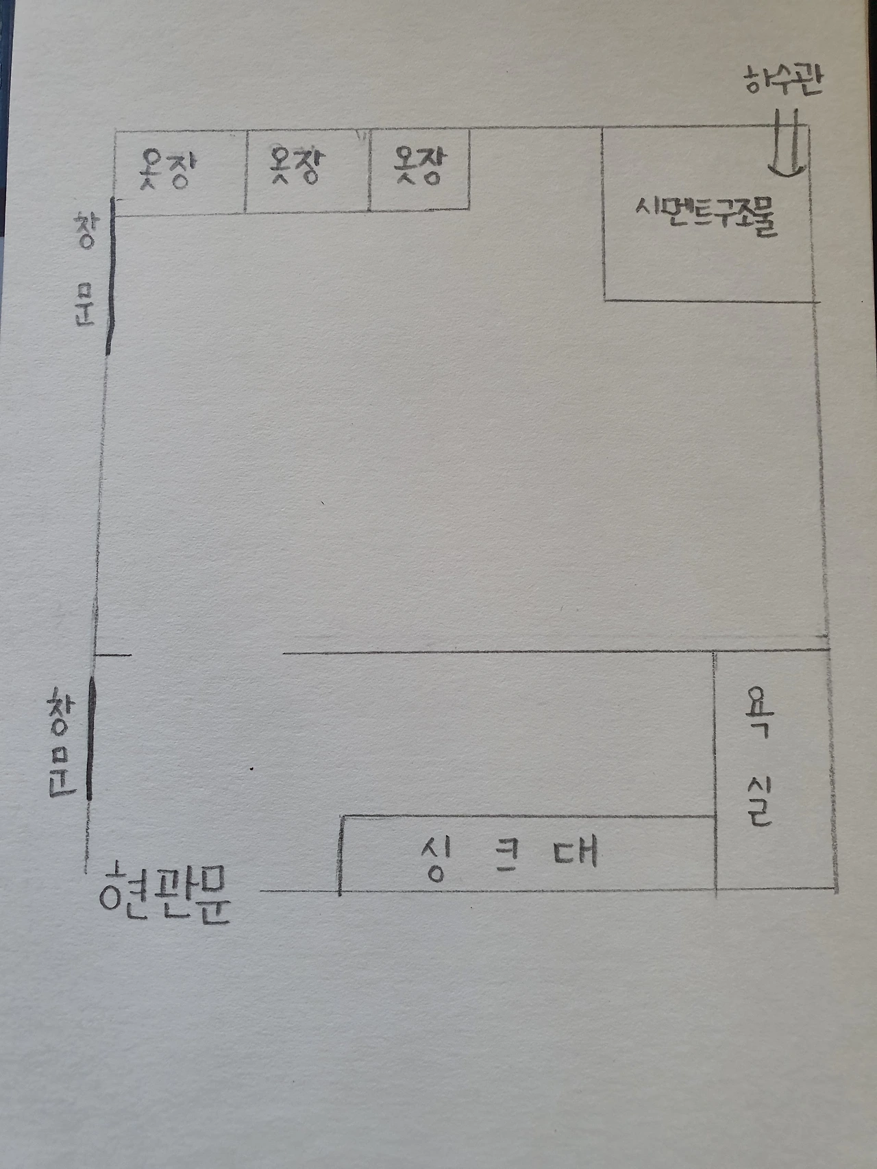 살림 다운 살림을 처음 차리는 아빠에게 할머니는 마땅히 해줄 것이 없다며 5자짜리 옷장 세트를 해주셨었다. 그림에는 영 소질이 없어 대충 자를 대고 그려본 그때의 단칸방, 옷장이 자리를 많이 차지하긴 했지만 시멘트 구조물이 워낙 위로, 옆으로 돌출되어 있어서 저 방 전체를 그 구조물 하나가 다 잡아먹는 것 같았다. 그렇게 그곳은 나만의 무대였다.