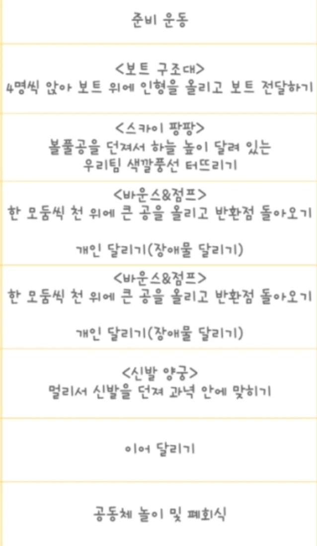 두 학년씩 묶어 각 90분씩 진행하고, 점심은 급식이다. 이 간결한 운동회 일정은 코로나 여파인 걸까? 아니면 요즘 트렌드인 걸까? 내가 너무 '라떼'의 추억에 빠져 트렌드를 못 따라갔나 보다. 여하튼 학부모로 맞은 첫 운동회는 일정표부터 참 낯설고 심플했다.