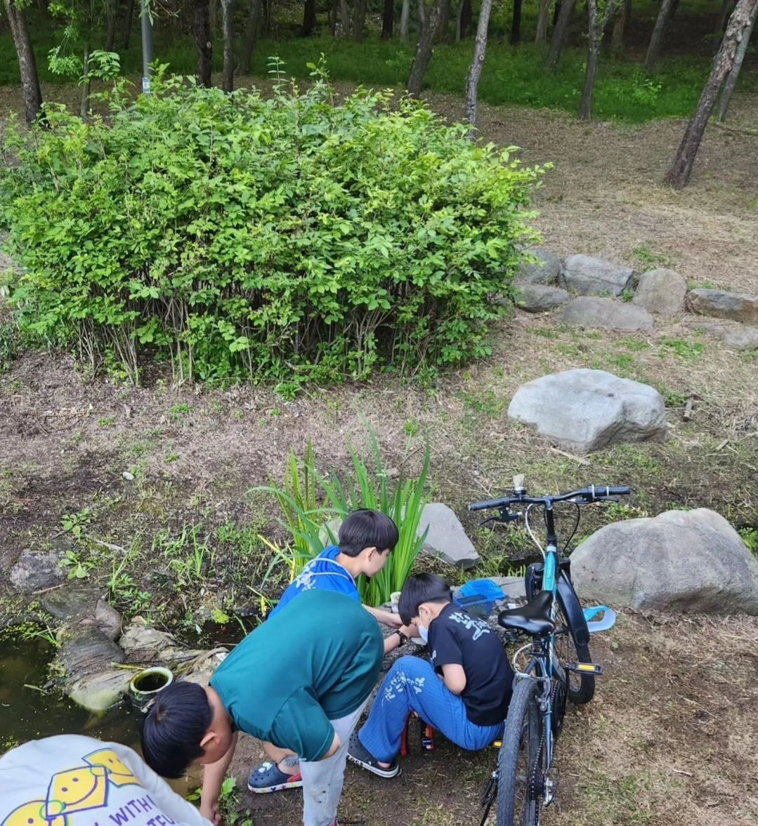집 근처에 널찍한 환경 공원이 있다. 지난주 아이들과 자전거를 타러 들렀다가 잠시 쉬는데, 연못 근처에 낯익은 동네 아이들 몇 명이 몰려 있었다. 그중 한 녀석이 큰 아이와 친분이 있는지 쪼그려 앉은 엉덩이를 들썩였다.