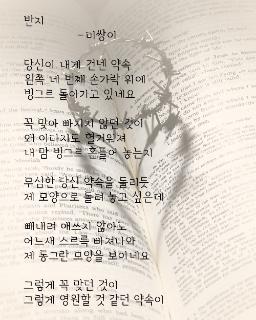 이 시에서의 반지는 사랑의 증표이지만 이별을 원망하는 매개로 쓰였다. 지금으로부터 딱 20년 전의 내가 이별을 겪고 쓴 시다. 날것 그대로였던 시를 조금 다듬어봤다. 그래도 여전히 형편없다면나의 수준이 딱 그 정도인 거겠지. 하지만 언젠가는 나아지지 않을까...? 가끔 글을 끄적일 때마다 감히 기대해 본다. 그 순간만큼은 0.0001mm의 성장이라도 있기를 바라는 마음이다.