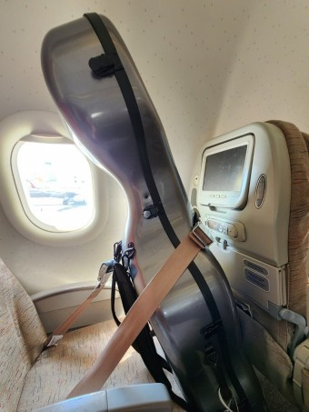 이렇게 커다란 악기가 비행기에 실릴 때는 좌석 하나를 더 구매하도록 되어있습니다. 빈자리(바닥 공간)에 세워 고정시켜야 하지요. 만약에 있을 비상 상황에 대비해 창가 쪽에 세우되, 안전 관련 영상이 나오는 모니터를 가려서는 안 됩니다. 그런 이유로 더 큰 사이즈의 악기들은 기내에서 본 적이 없습니다. 규정을 초과하는 큰 악기들은 수하물로 실릴 테니까요.