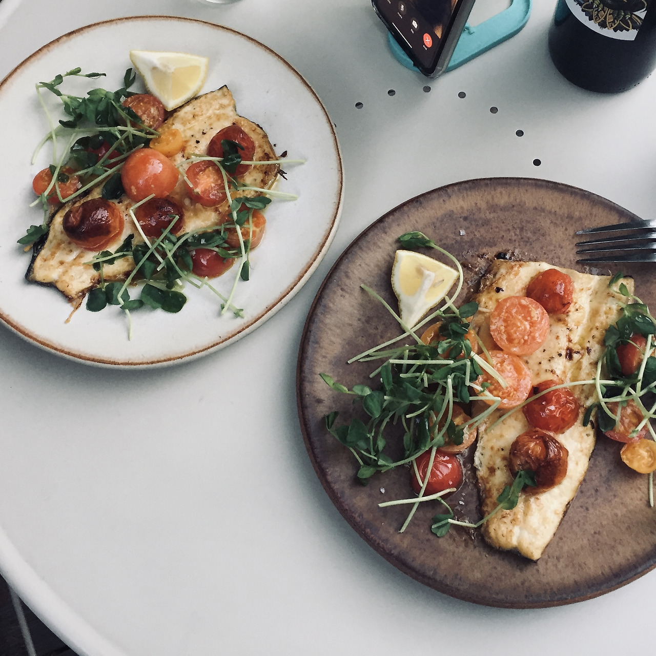 남편은 저녁을 만들어줬다. 씁쓸한 맛이 나는 어린잎채소와 토마토를 올린 버터에 구운 송어 요리.