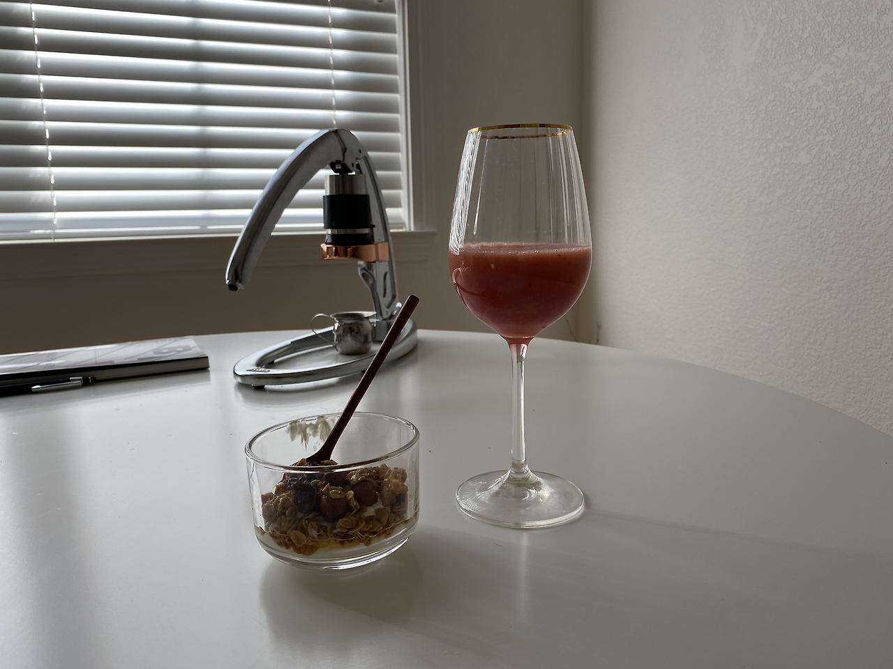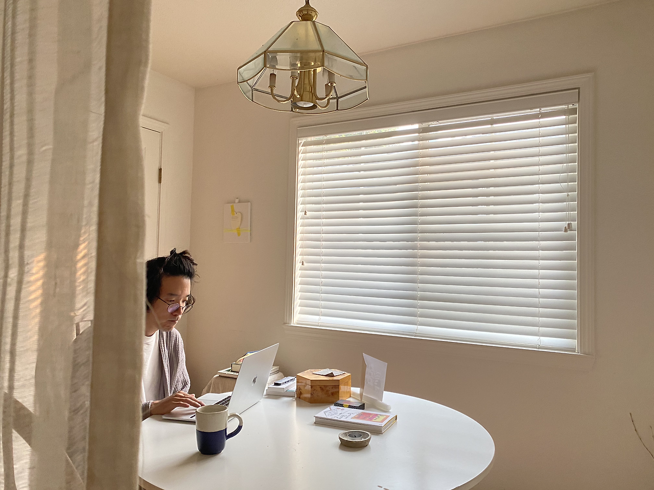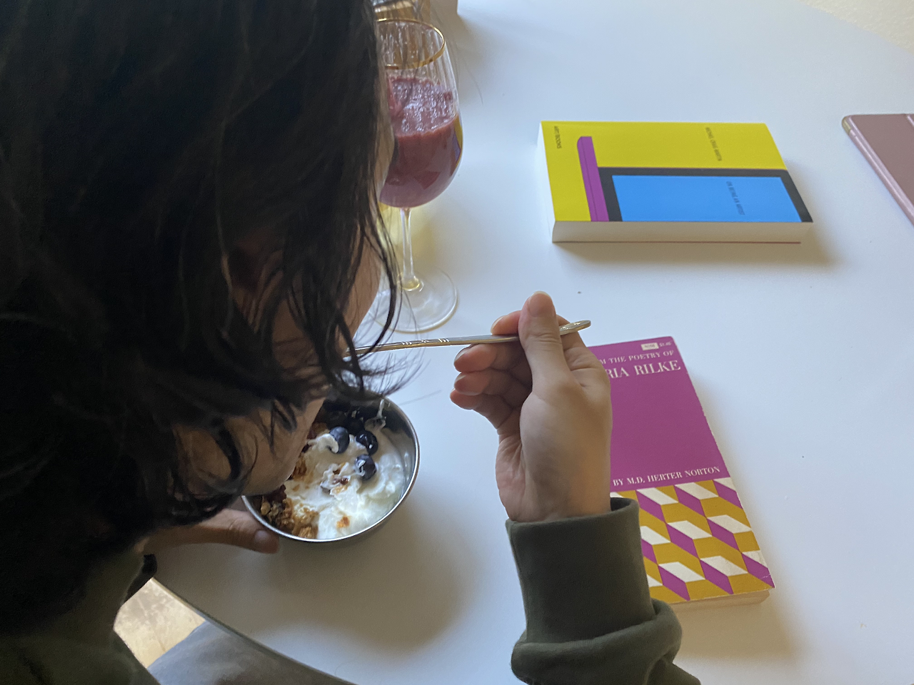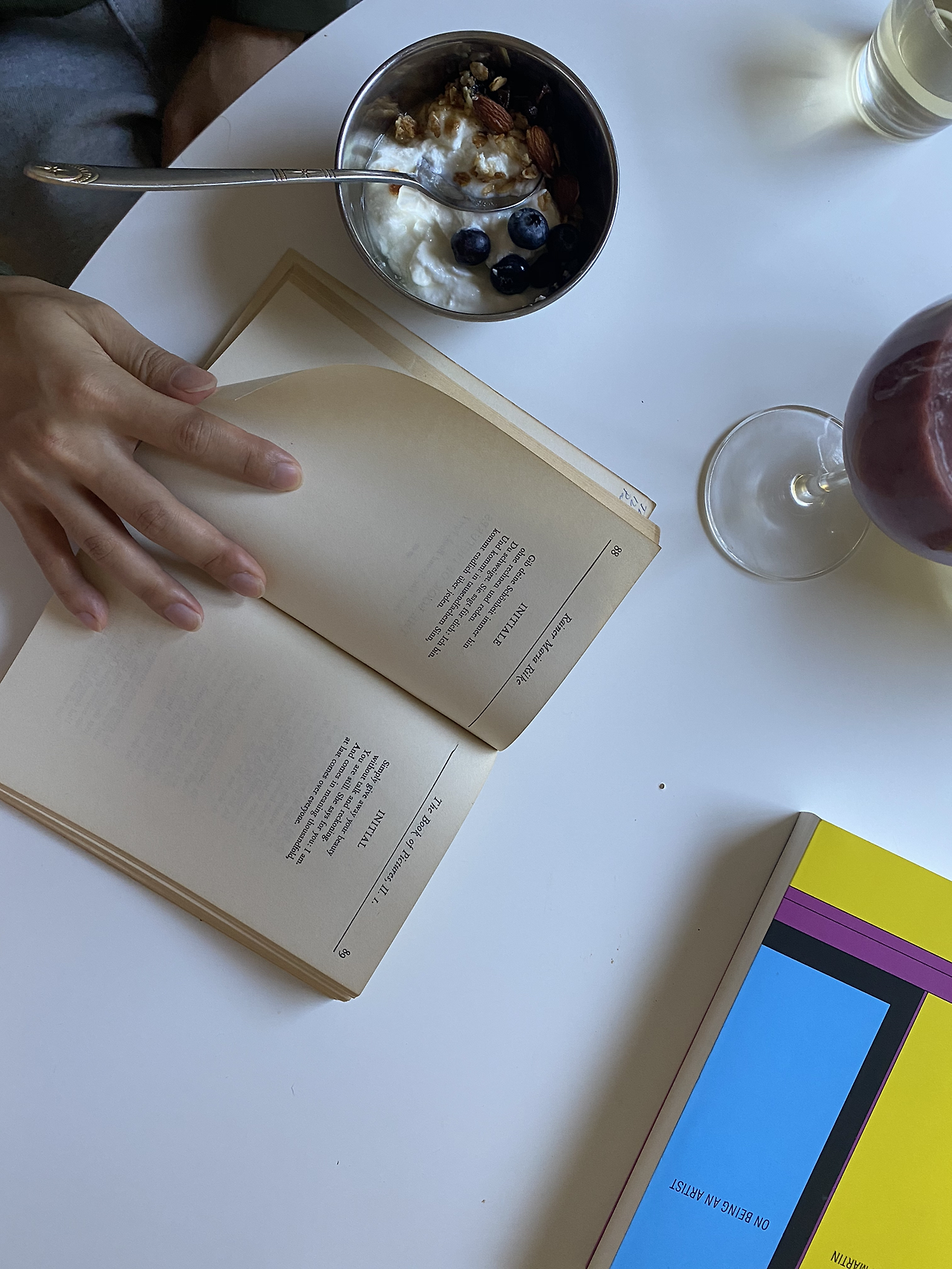 기분 좋은 아침을 맞이하도록 깔맞춤 소품도 적절히 배치했다. 보리차 노란색에 맞춰 남편이 야금야금 읽는 On Being an Artist 책을 무심히 던져 놓고, 보라빛 스무디 색깔의 릴케 시집을 놓았다.
