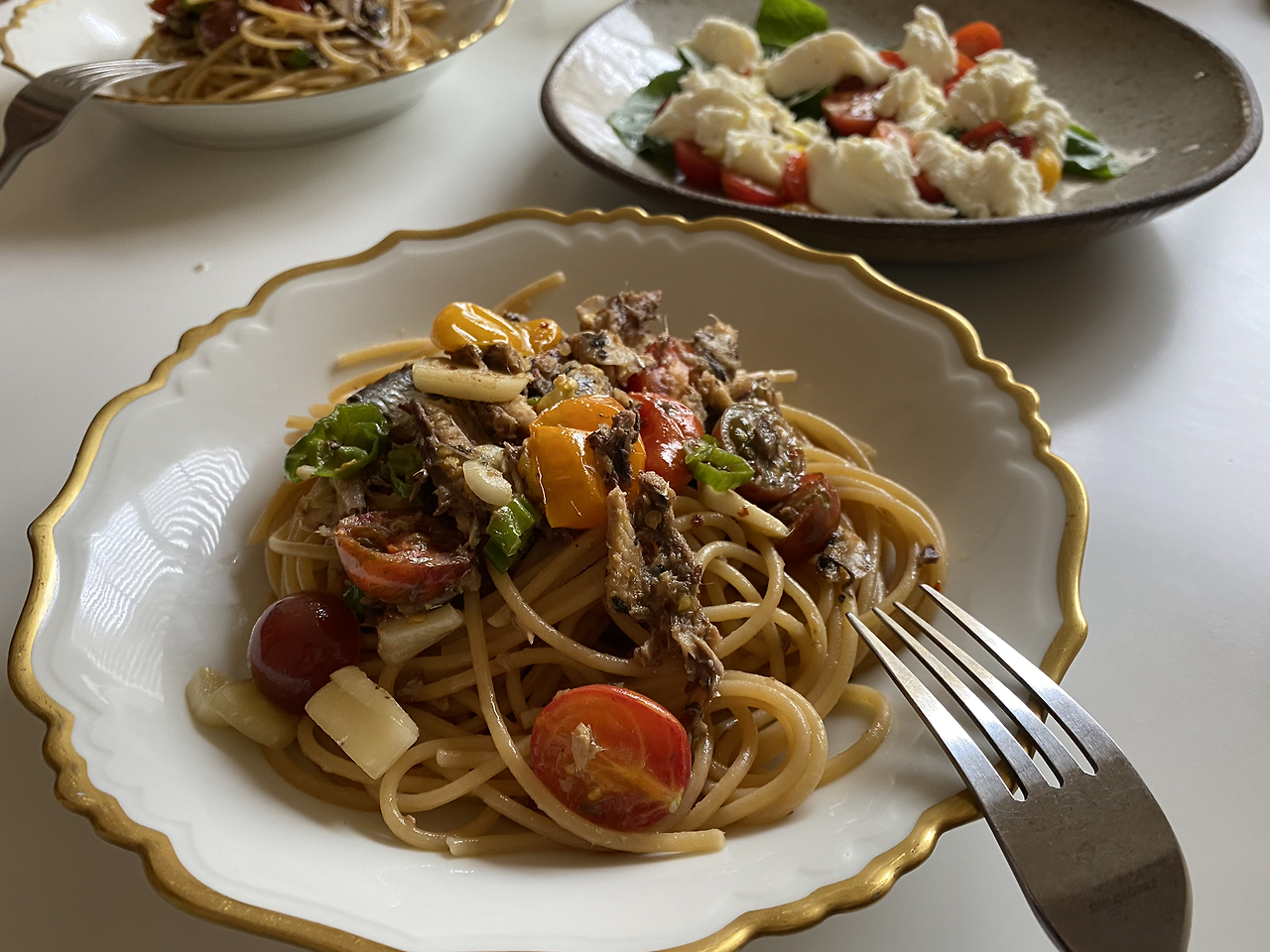 그 전전날 점심에도 남편은 꽈리고추와 토마토를 얹어 매콤 새콤한 맛이 나는 정어리파스타를 만들어 카프레제 샐러드와 내어줬다.
