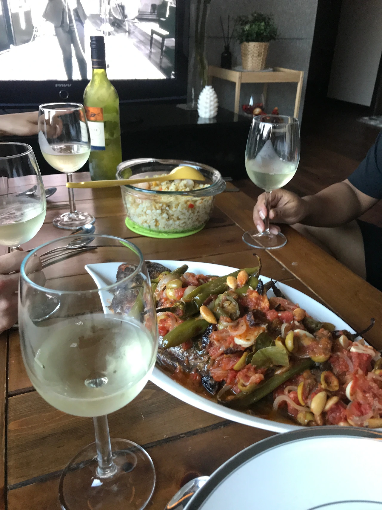 프라이팬 가득한 소스가 완성이 되었다 싶으면 오븐 판에 도미를 올리고 그 위에 소스를 얹어요. 이때 소스에 올리브 오일을 3 테이블스푼 정도 추가해요. 이제 165도에 맞춘 오븐에 도미를 집어넣고 맛있게 익길 기다리는 거예요. 기다리는 동안 B가 튀겨온 닭을 맥주와 함께 먹으며 이따가 다 같이 볼 영화를 고르기 시작했어요. 다섯 명 모두 영화를 좋아하는 편이라 그 누구도 보지 않은 영화를 찾는 게 쉽지 않았어요. 결국 정하지 못한 채로 수다를 떨다가 20분이 지나 도미를 조심스럽게 뒤집어 다시 오븐에 집어넣고 다시 영화 고르기에 몰입했어요.