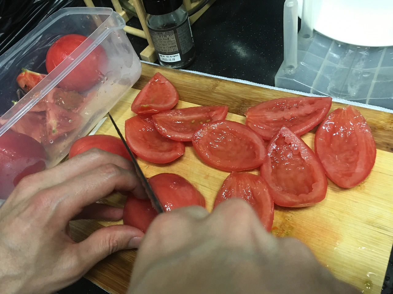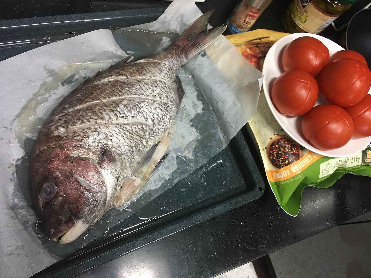 두 사람이 주방에서 분주한동안 아까 사 온 도미는 레몬즙과 소금을 입은 채로 조용히 대기 중이에요. 커다란 도미의 얼굴과 이빨을 신기한 듯 구경하다가 도울 게 없나 어슬렁거리던 저희들에게도 할 일이 주어졌어요. 칼집을 내서 살짝 데친 토마토의 껍질을 벗겨내는 거예요. 그런 다음에 토마토의 씨 부분을 다 도려냈어요. 다이애나 할머니의 레시피에는 딱히 그렇게 쓰여있진 않았지만 토마토 씨 부분이 여기저기 섞이면 보기에 별로라고 알피는 과육 부분만 쓰는 걸 택했어요.