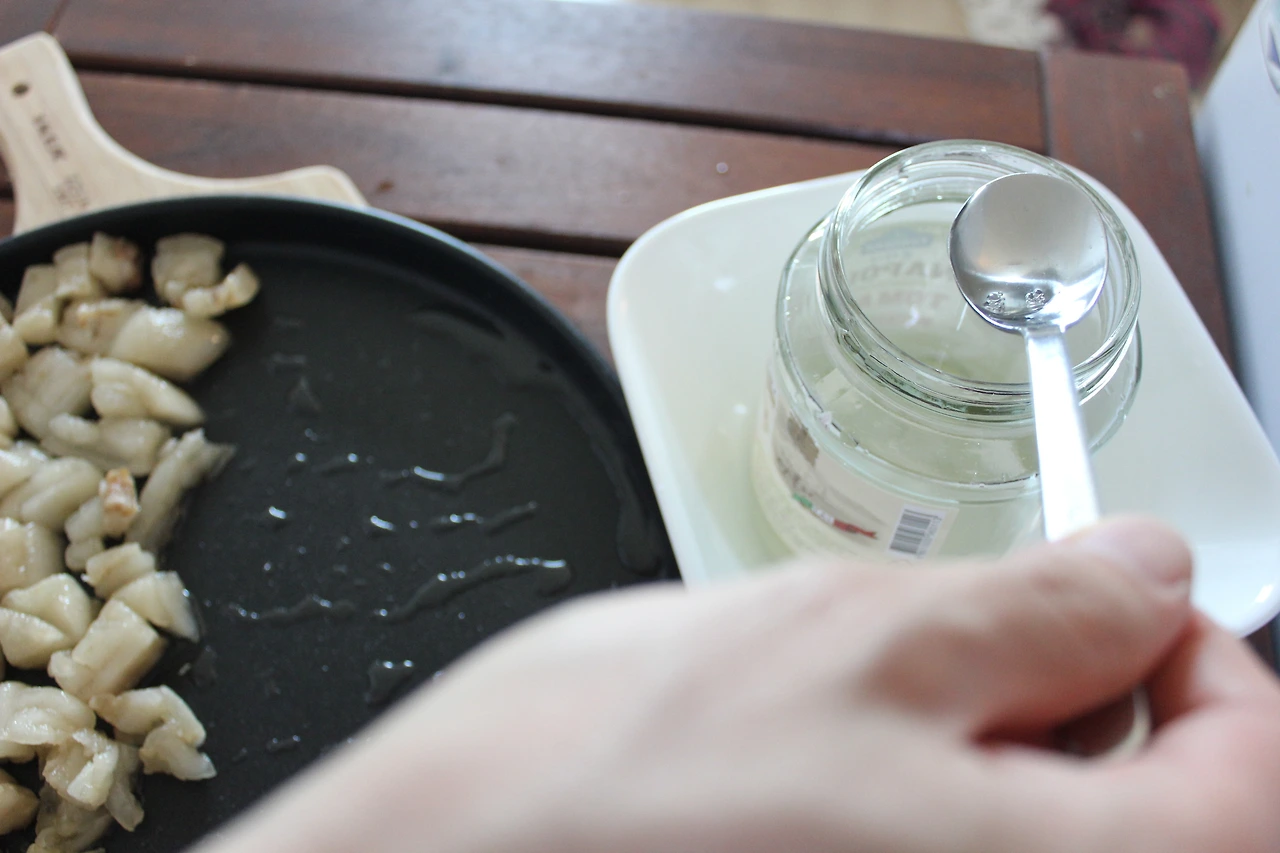 어느덧 잼 사이즈의 유리병이 기름으로 찼어요. 이 기름이 바로 '라드'예요. 불순물이 없는 맑은 기름이에요. 돼지기름을 낸다는 말을 들었을 때는 누런 기름을 상상했는데 말이죠. 냉장고에 넣고 굳히면 뽀얗게 변하는데 예쁜 용기에 넣으면 소이캔들이라고 해도 다들 속을 것 같아요. 게다가 스푼으로 살짝 뜨면 얼마나 부드럽고 예쁘게 떠지는지 몰라요.
