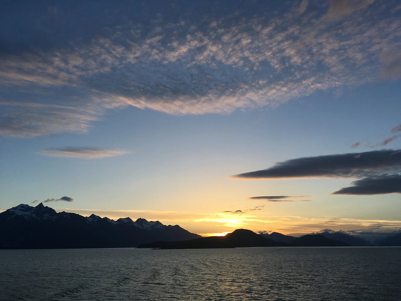 금요일에 시애틀에서 출발한 익스플로러호는 현재 알래스카 스캐그웨이(Skagway)를 향해 가고 있답니다. 알래스카의 여름은 해가 참 길어요. 밤 열 시가 넘어야 해가 지고, 새벽 네시가 되기도 전에 일출을 볼 수 있어요. 하루의 업무가 끝나고 저녁식사를 하는 오후 여덟 시에도 대낮같이 환해서 점심을 두 번 먹는 기이한 느낌이에요. 이럴 때는 창문이 없어서 문만 닫으면 완벽한 어둠을 누릴 수 있는 크루 캐빈이 고마워지네요.