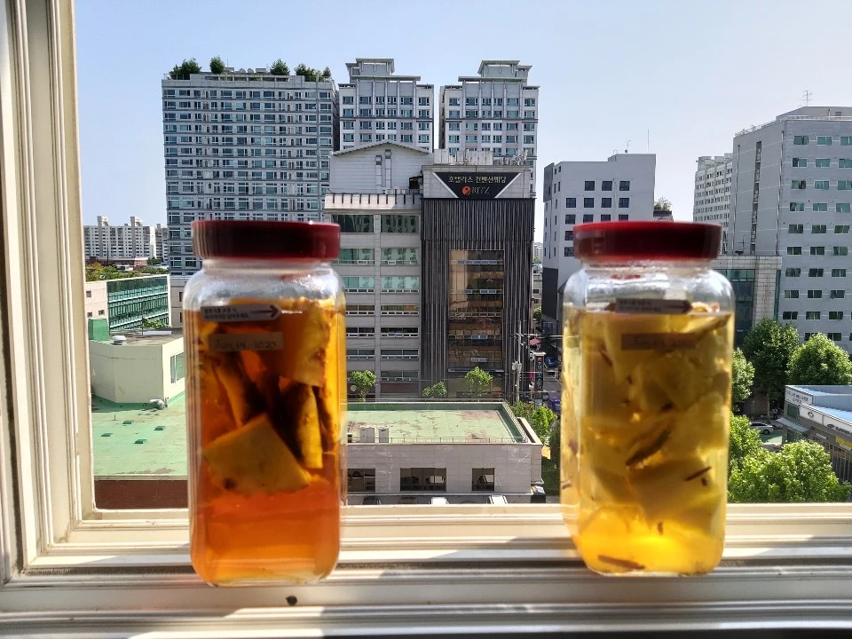 다음으로는 유리 용기 안에 물 1.5리터와 함께 흑설탕 4 테이블스푼을 잘 녹여요. 그리고 썰어놓은 파인애플 껍질들을 과육이 붙어있는 상대로 용기 안에 같이 넣으면 완성이에요. 참, 식초가 만들어지면서 가스가 발생하기 때문에 일반 용기의 경우 뚜껑을 닫고 보관했다가는 폭발해버릴 수 있어요. 공기가 통하는 천을 이용해서 고무줄로 묶어 보관하는 것도 방법이고, 아니면 안쪽 공기가 자동으로 배출되고 바깥공기를 차단하는 발효용 식품 전용 용기를 사용하는 것도 좋아요. 만들어둔지 아직 48시간이 안되었는데 벌써 뽀글뽀글 공기방울이 하나씩 올라오기 시작하네요.