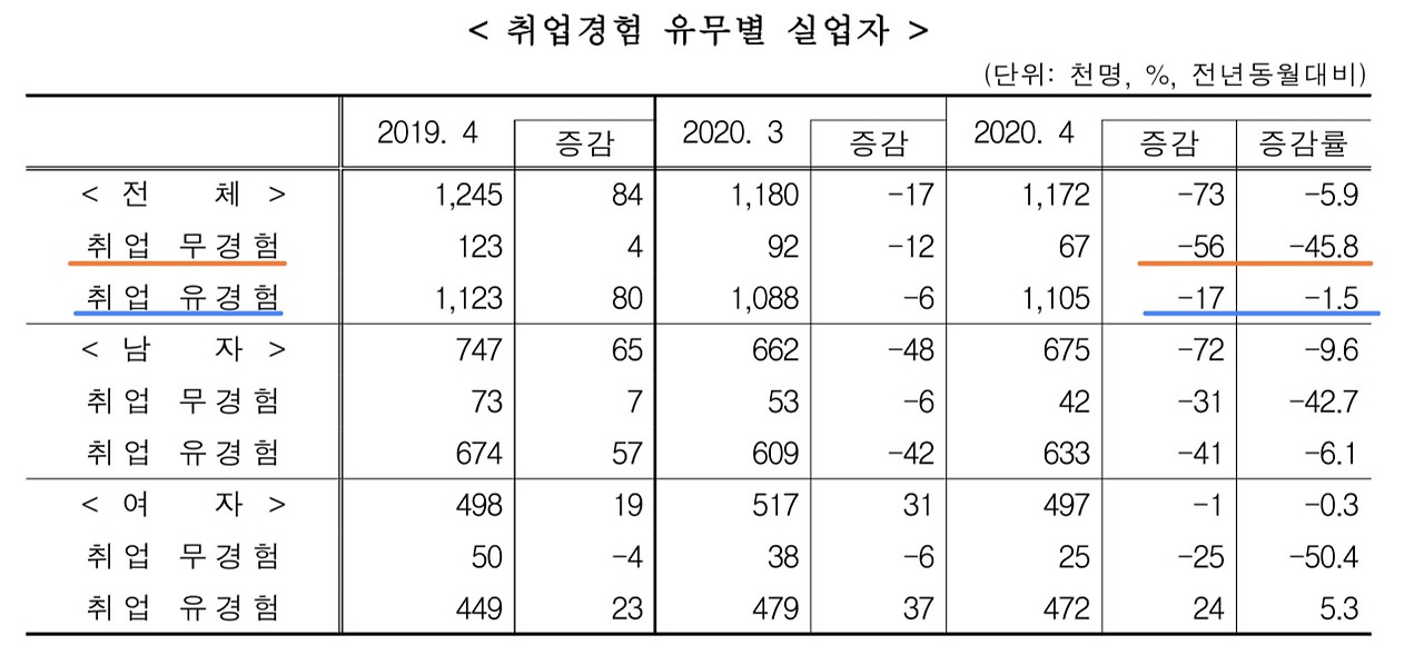 취업 경력 유무별 실업자 현황을 보면 취업에 대해 경험이 없는 지원자들의 실업률은 감소했다. 반면 취업 유경험자 즉 경력자의 실업률은 -1.5% 감소했다. 전체 산업 고용 동향에서 고용률이 -1.8% 감소한 것을 고려할 때 경력자들의 실업률은 줄어든 것이 아니다.