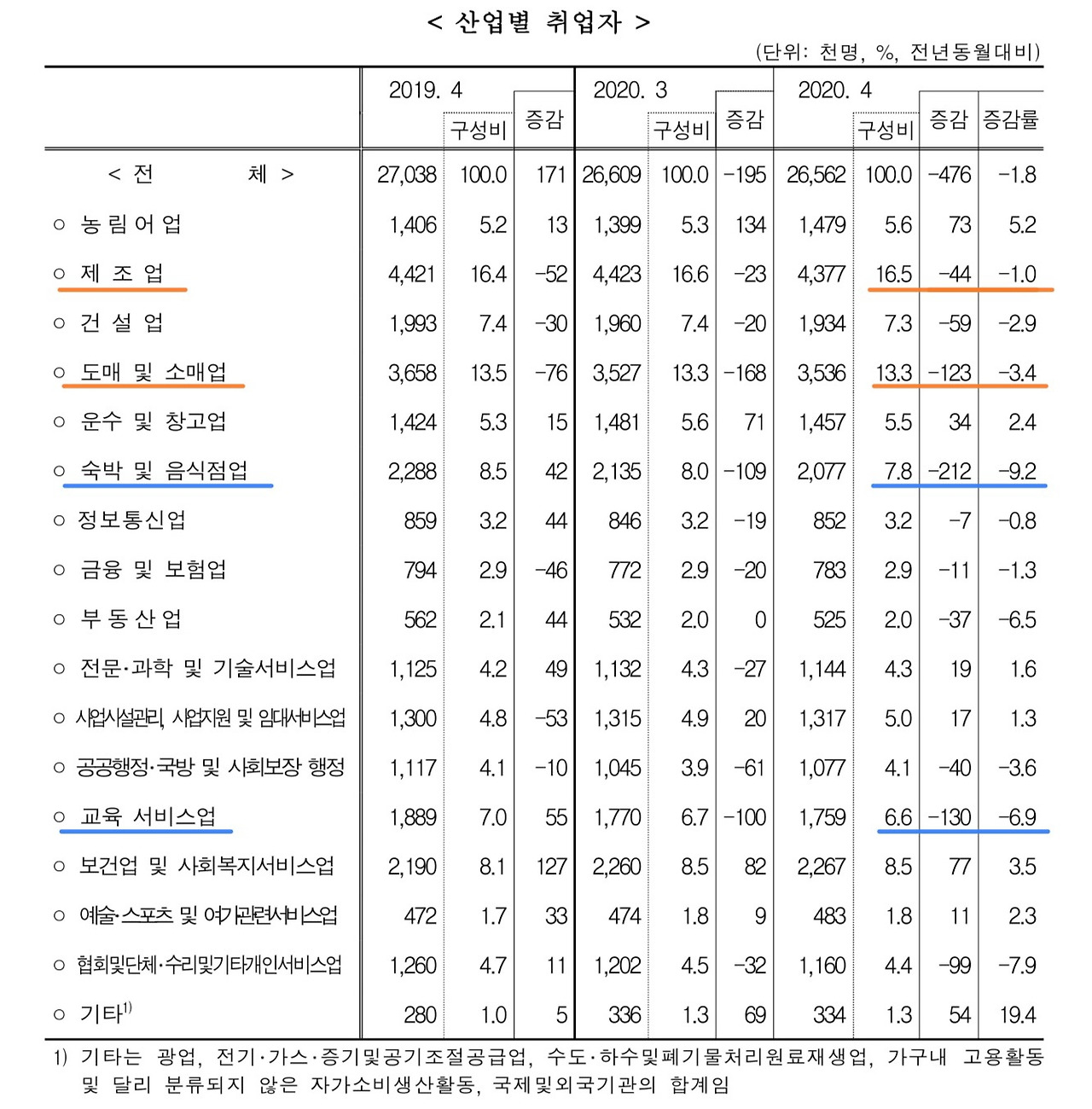 산업별 고용 현황을 보면 내수 시장에 가장 많은 비중을 차지하고 있는 제조업(16.5%), 도매 및 소매업(13.3%) 분야에서 전년 동기 대비 급격하게 하락했다. 증감률로 비교해보면 낮은 것처럼 보이지만, 전체 숫자로 비교해볼 때 각 제조업은 4만 4천 명, 도매 및 소매업은 12만 3천 명 감소했다. 특히 도매 및 소매업은 이해가 가는 숙박 및 음식점 다음으로 급감했다. 제조, 도매, 소매의 취업자가 줄어들면 소비시장도 위축될 확률이 높다.