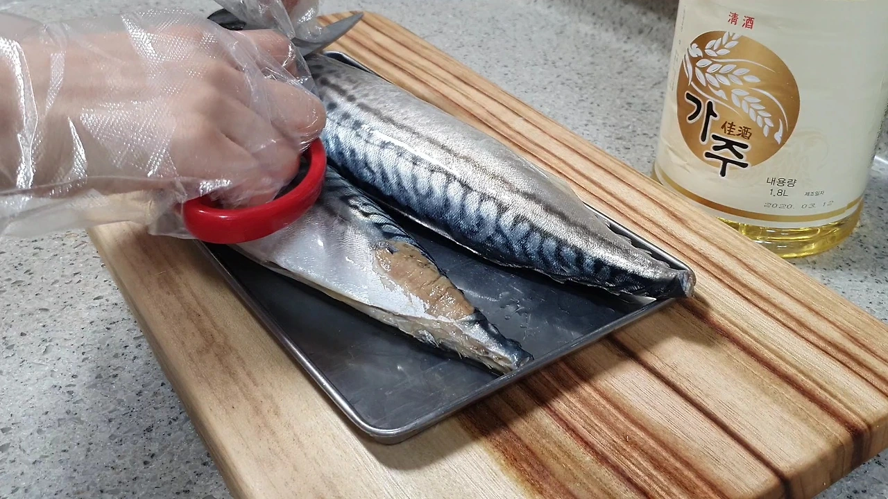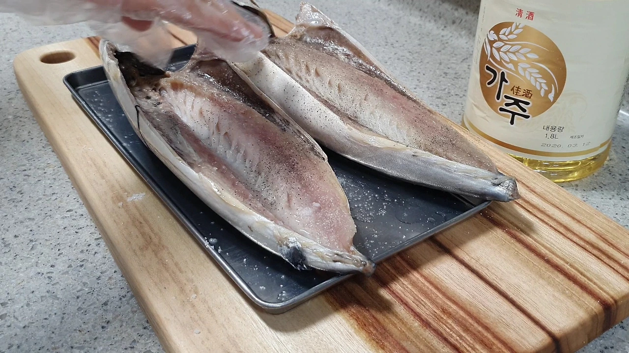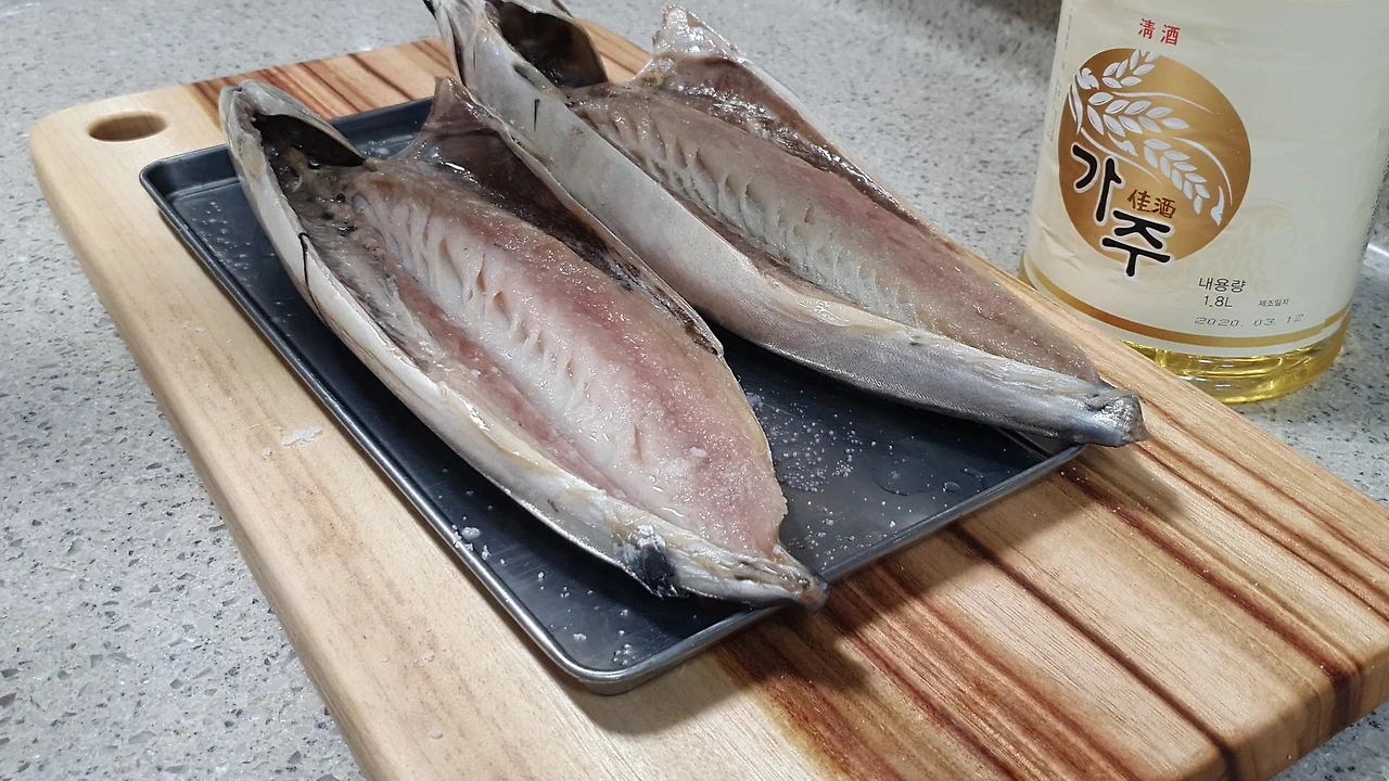 재료 : 고등어 한팩 양념재료 : 소금 솔솔 후추 솔솔 가주 <맛술 2스푼>