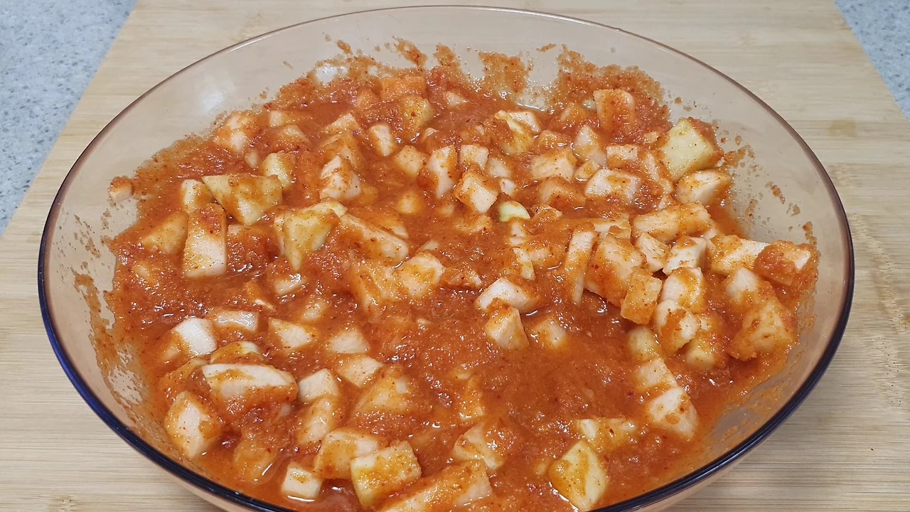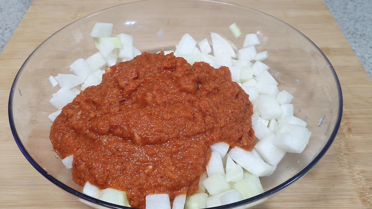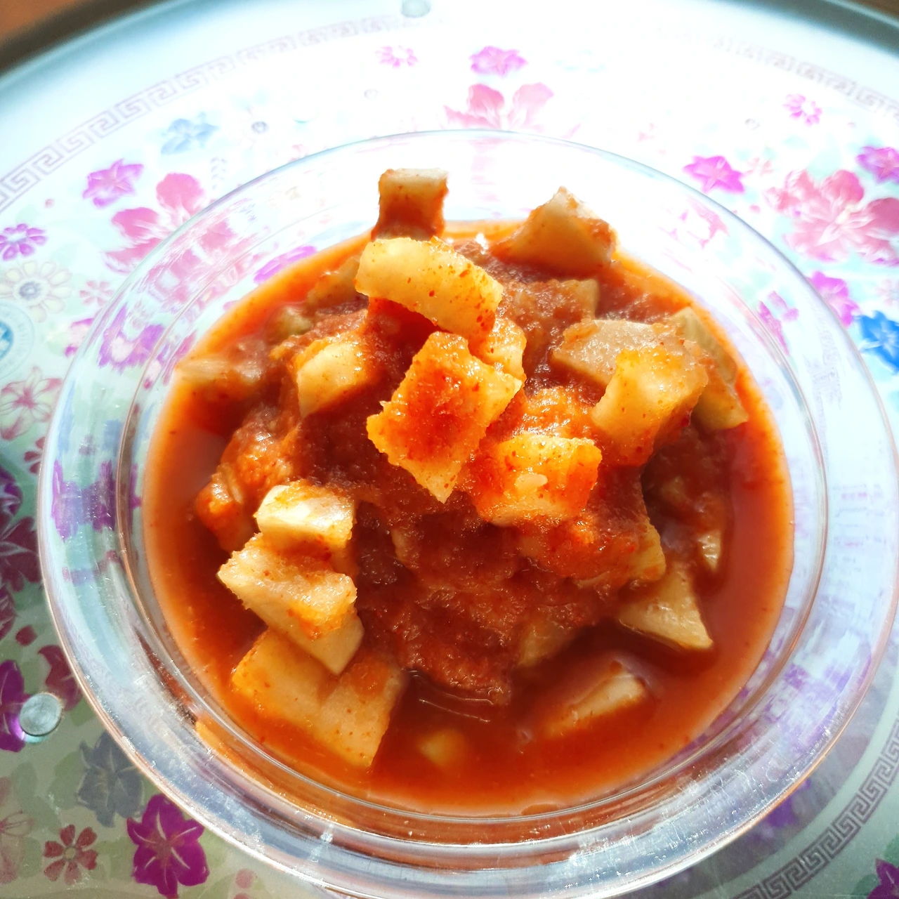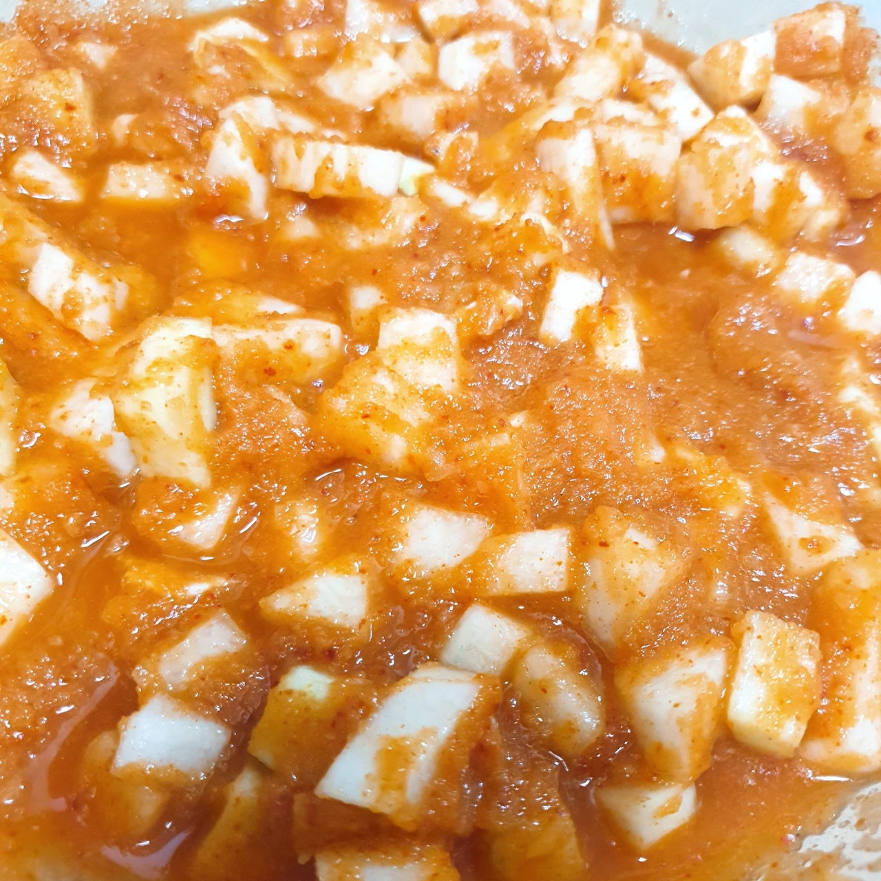 재료 소개무1개 양파반쪽 물약간<무절일때 소금1스푼 뉴슈가 약간>양념 만들기 고추가루4스푼 마늘1스푼 액젓2스푼 새우젓약간 매실청1스푼 생강가루1스푼 설탕1스푼 <어른수저기준입니다.>