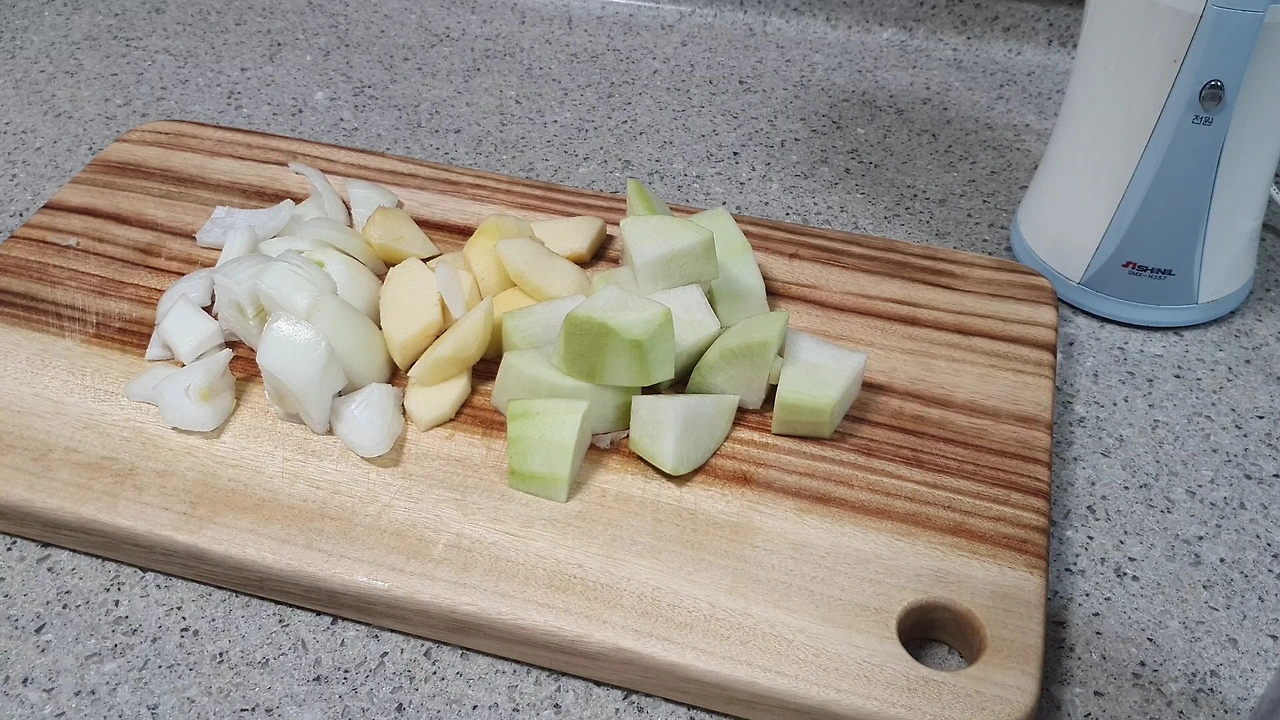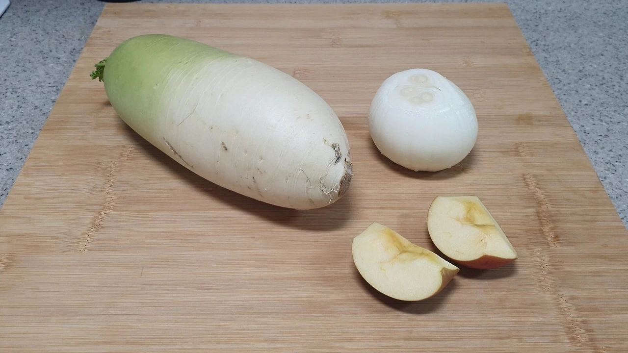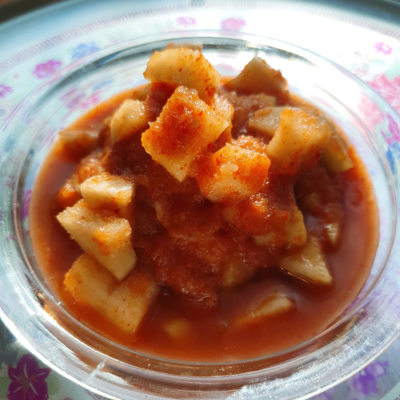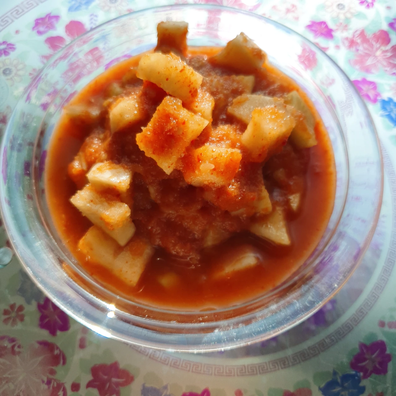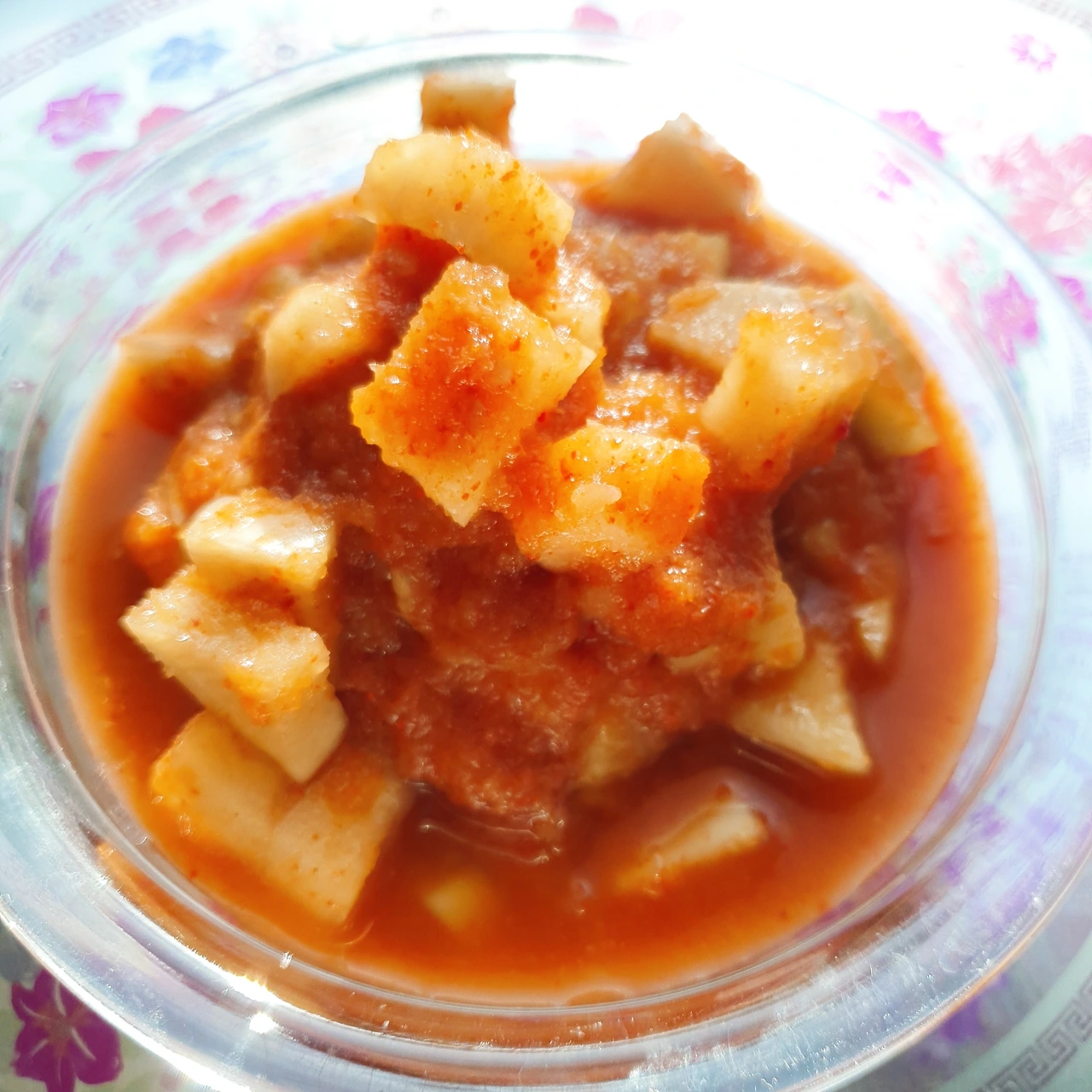재료 소개무1개 양파반쪽 물약간<무절일때 소금1스푼 뉴슈가 약간>양념 만들기 고추가루4스푼 마늘1스푼 액젓2스푼 새우젓약간 매실청1스푼 생강가루1스푼 설탕1스푼 <어른수저기준입니다.>