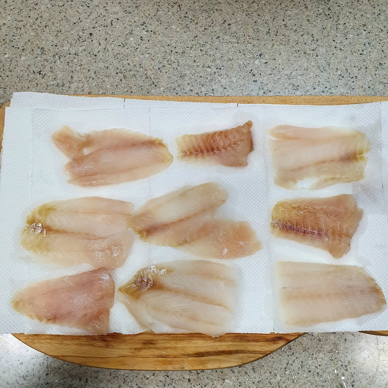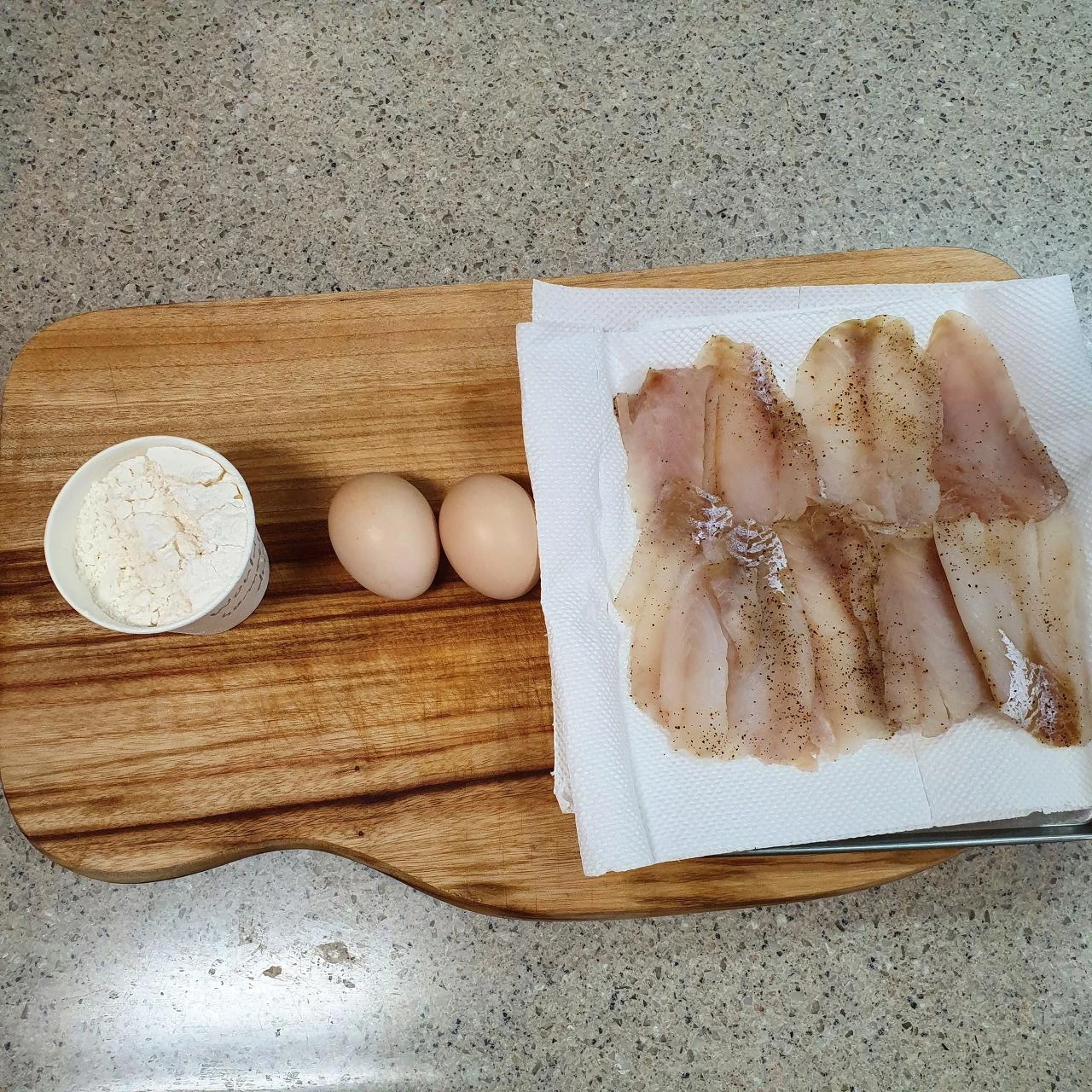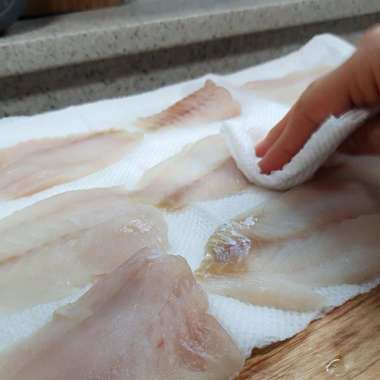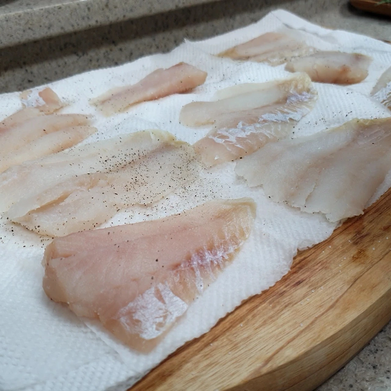 3. 키친타올 위에 씻은 동태포를 올려주세요 그리고 위를 키친타올로 살살 물기제거를 해주세요