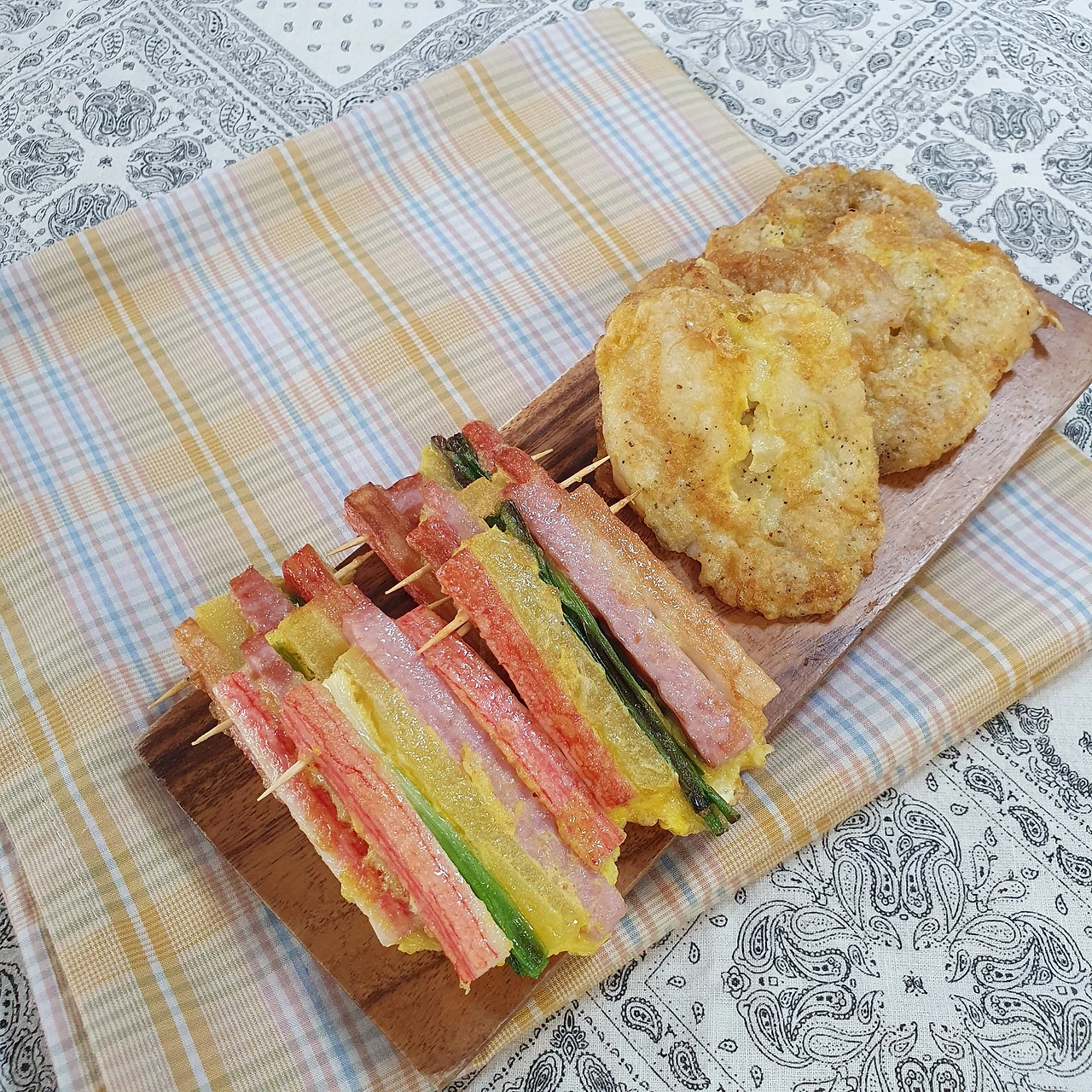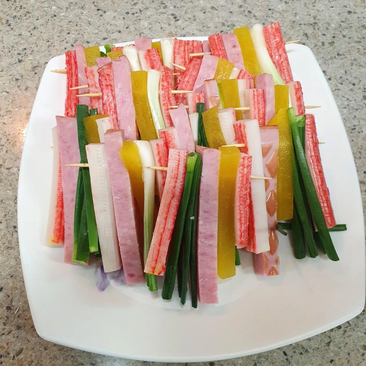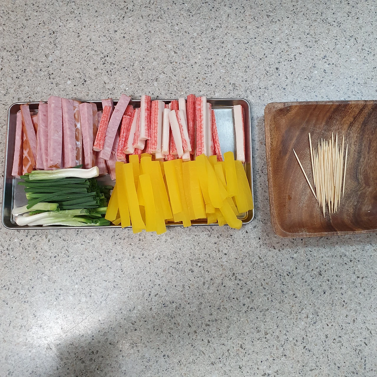 재료 : 오양맛살 햄 쪽파 단무지 이쑤시개