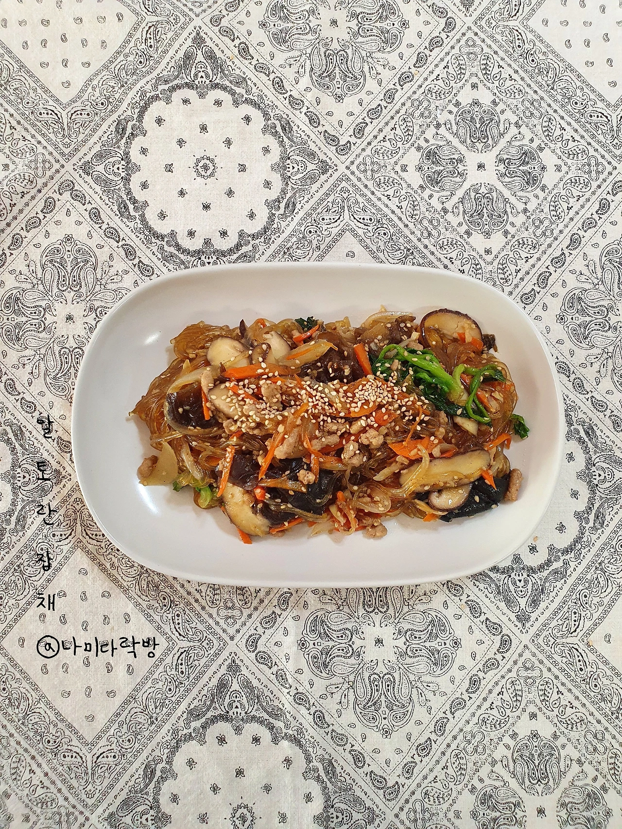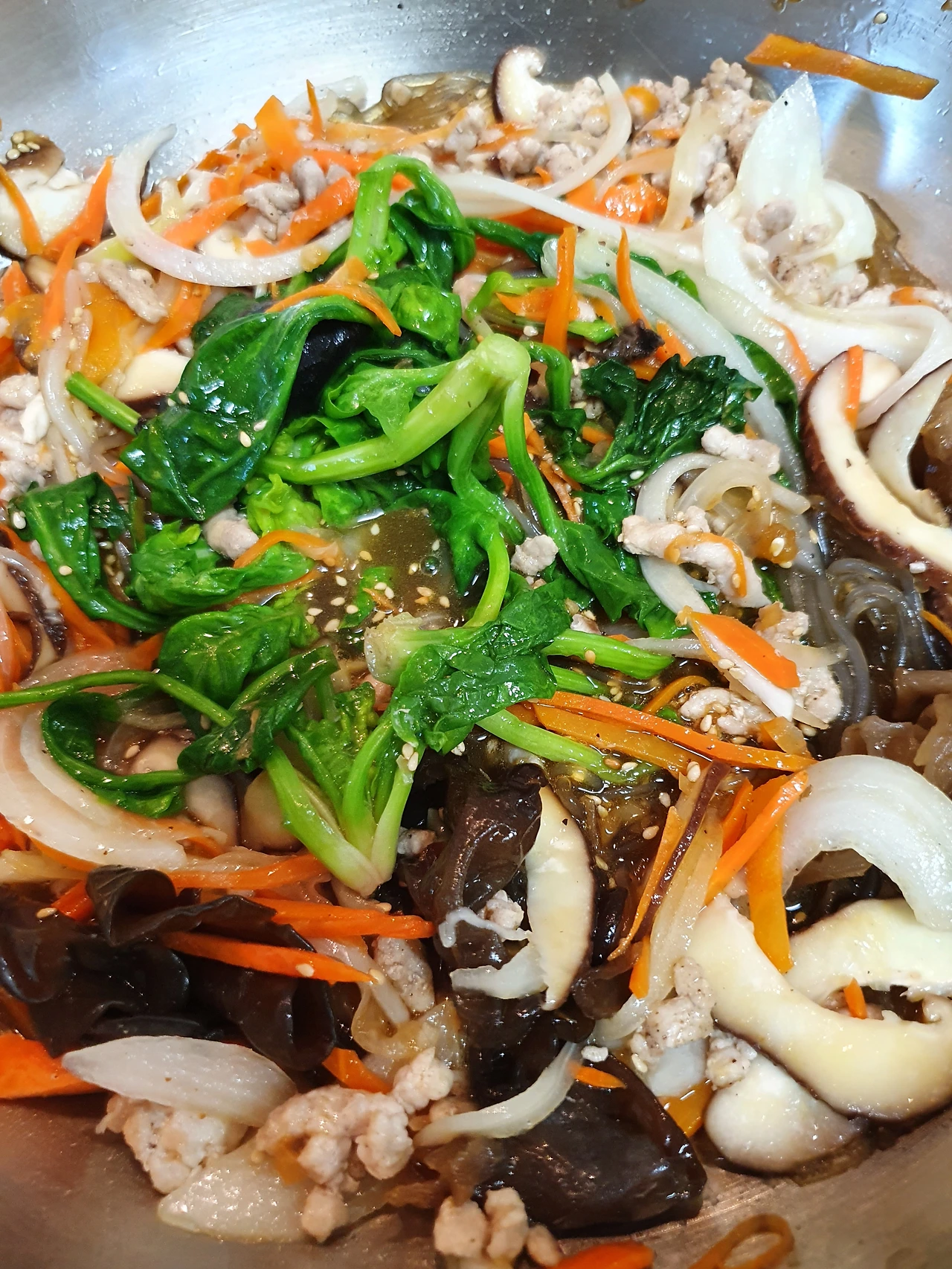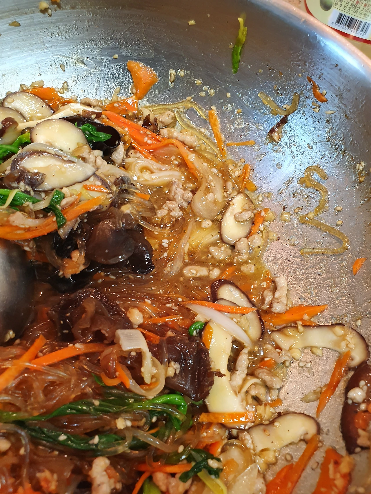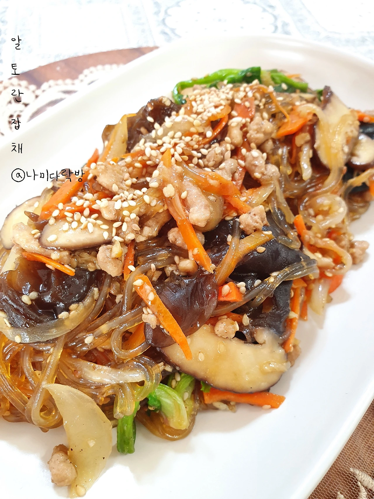 잡채만들기재료 : 당면 시금치 양파반쪽 당근 목이버섯 돼지고기 표고버섯당면 끓을때 넣는 재료 : 종이컵3컵 식용유3스푼 진간장2스푼양념재료 : 진간장5스푼 설탕3스푼 들기름2스푼 후추약간야채 볶을때 : 식용유2스푼 후추약간