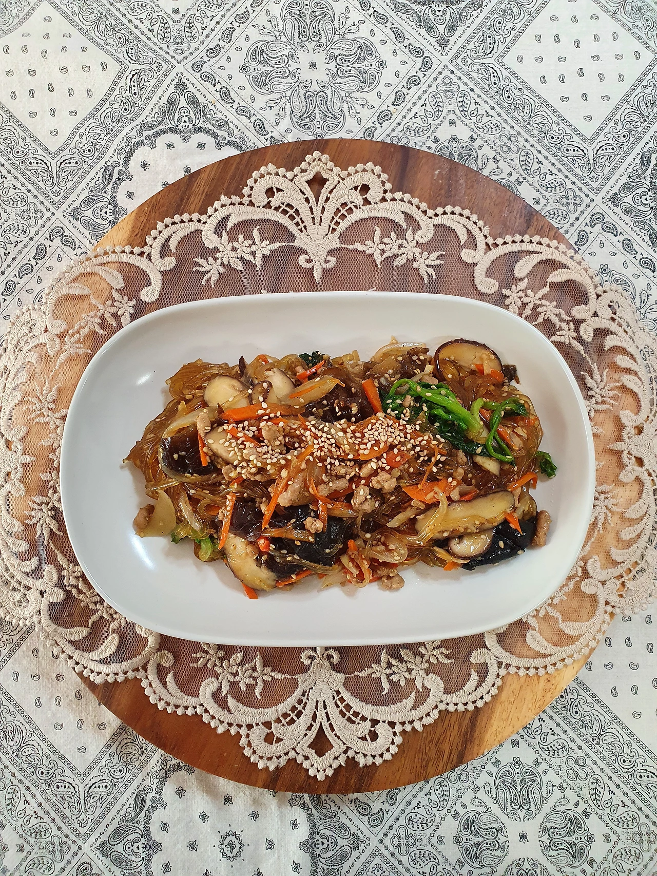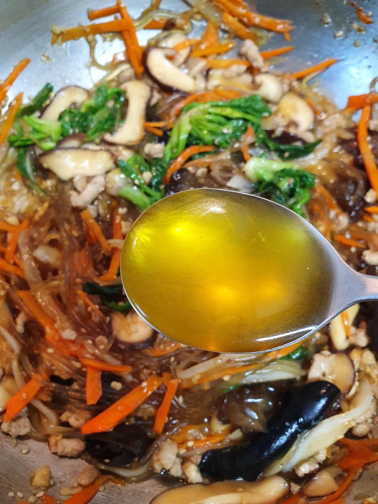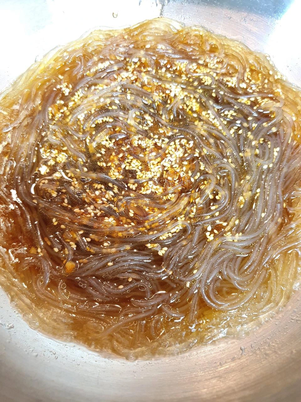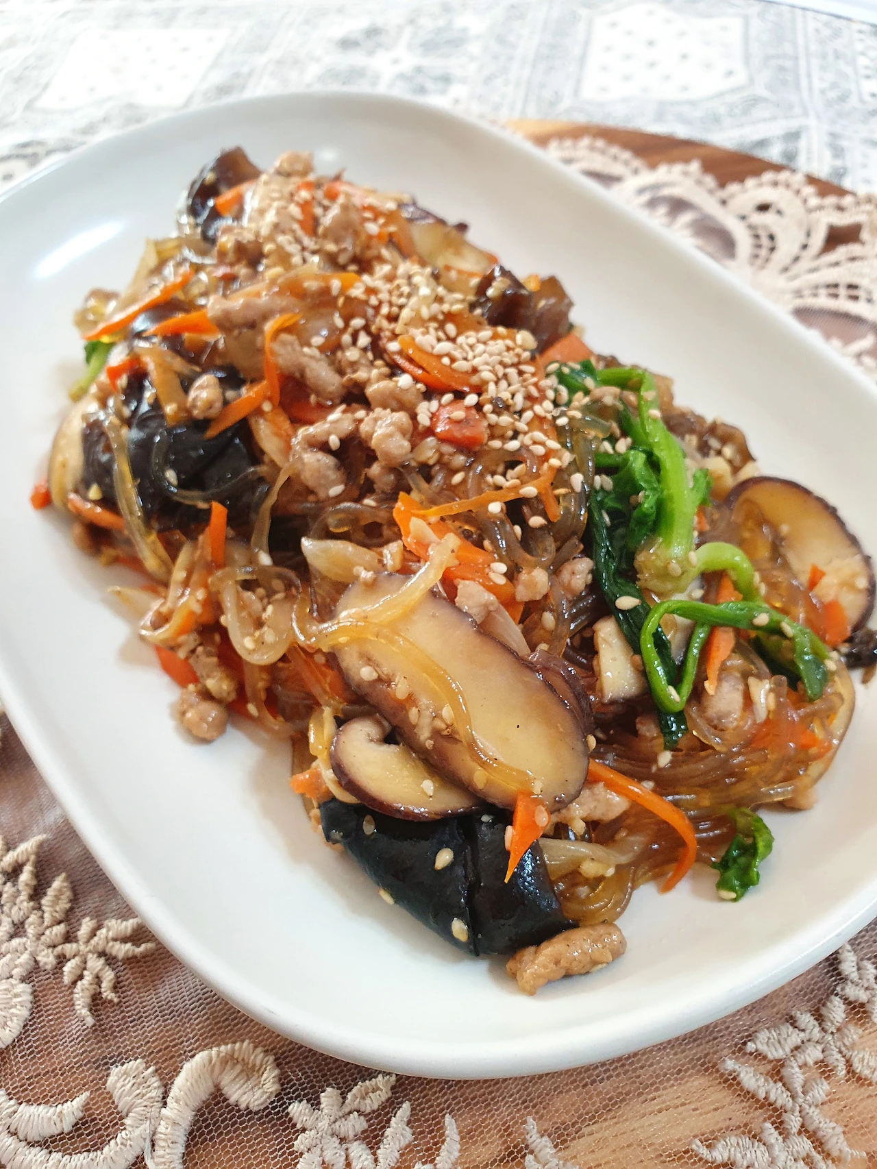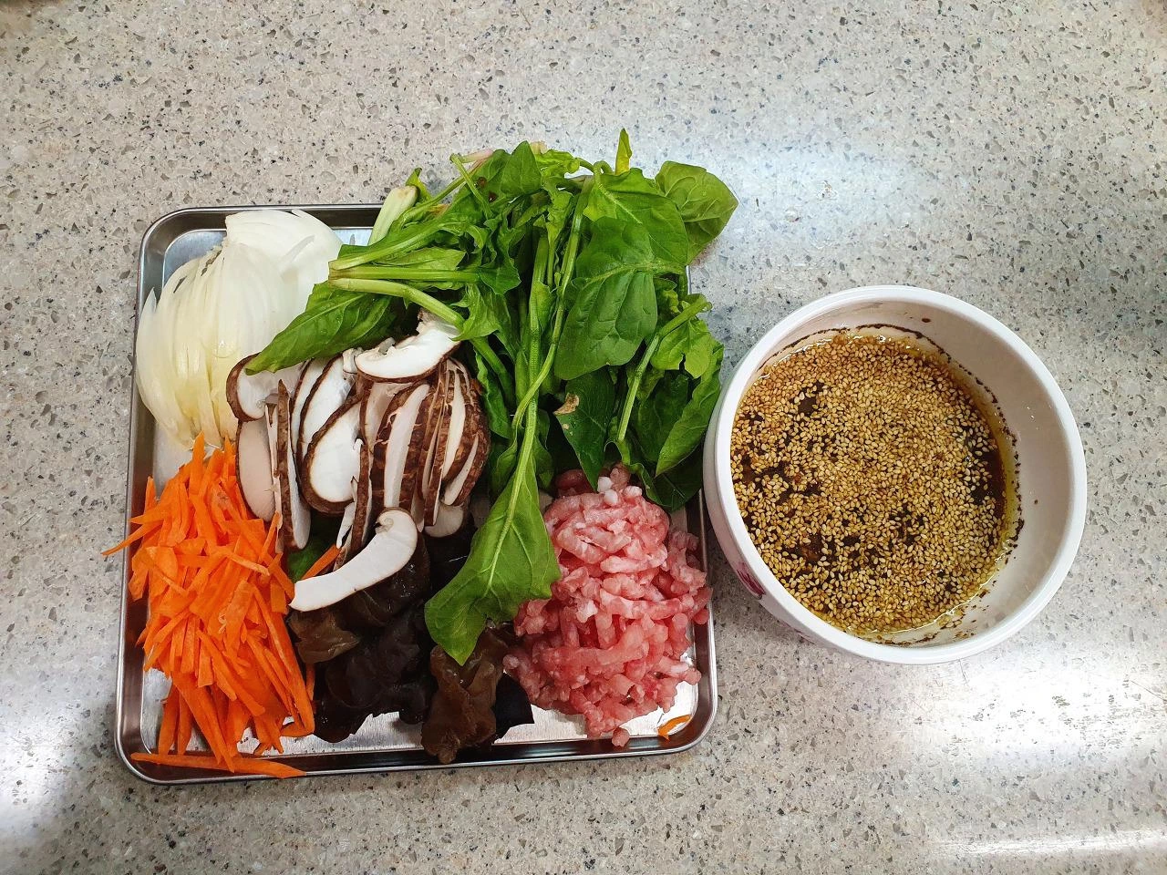 잡채만들기재료 : 당면 시금치 양파반쪽 당근 목이버섯 돼지고기 표고버섯당면 끓을때 넣는 재료 : 종이컵3컵 식용유3스푼 진간장2스푼양념재료 : 진간장5스푼 설탕3스푼 들기름2스푼 후추약간야채 볶을때 : 식용유2스푼 후추약간