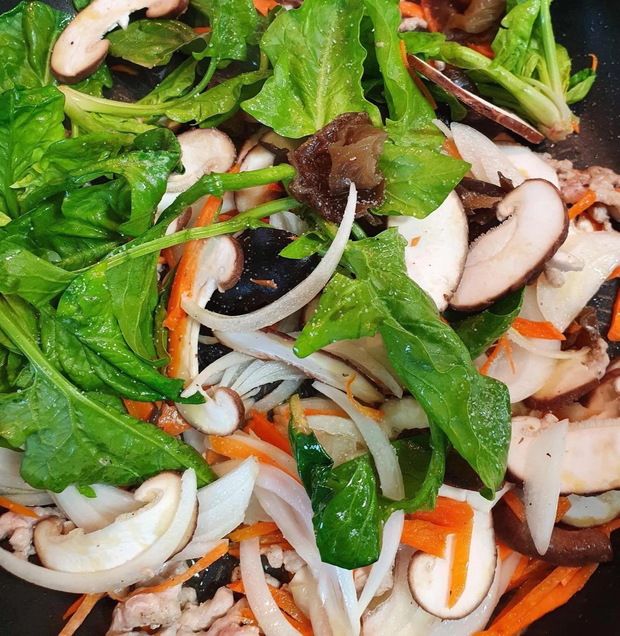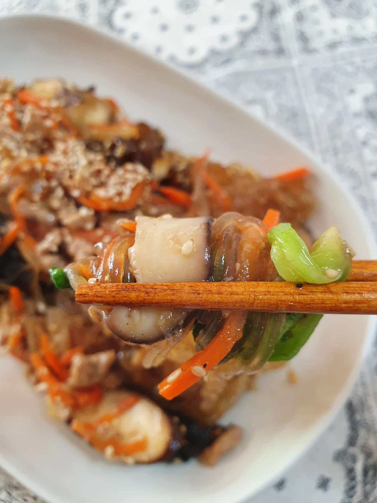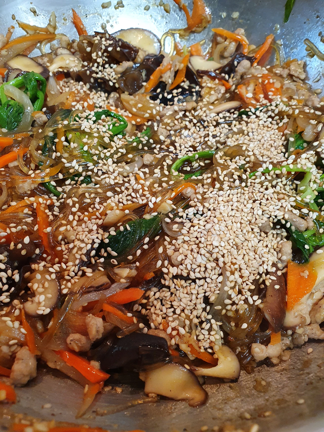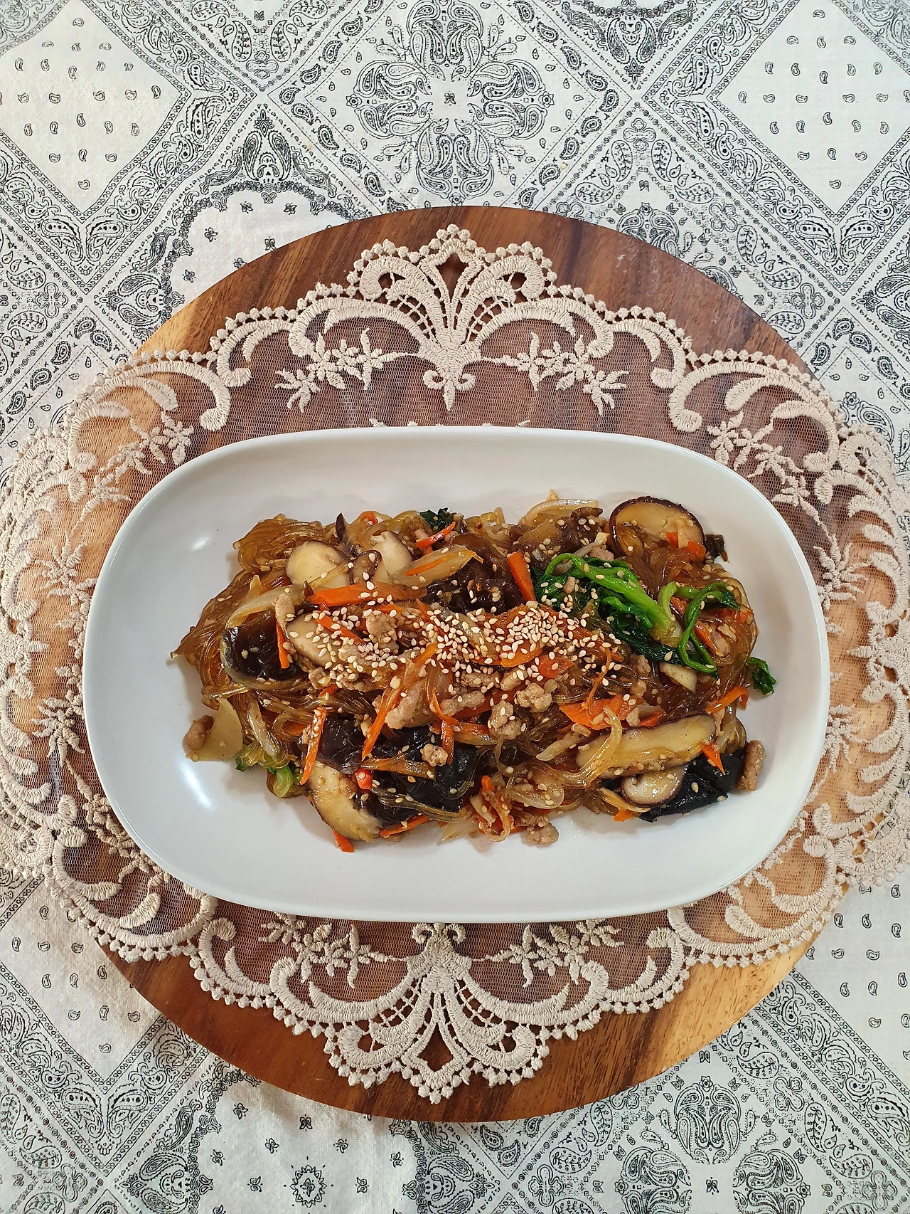 잡채만들기재료 : 당면 시금치 양파반쪽 당근 목이버섯 돼지고기 표고버섯당면 끓을때 넣는 재료 : 종이컵3컵 식용유3스푼 진간장2스푼양념재료 : 진간장5스푼 설탕3스푼 들기름2스푼 후추약간야채 볶을때 : 식용유2스푼 후추약간