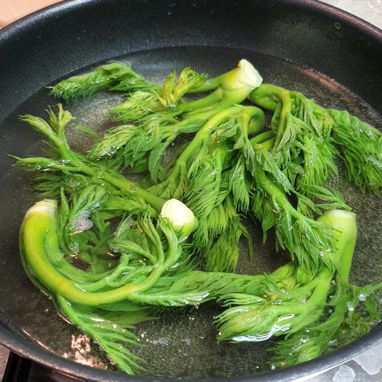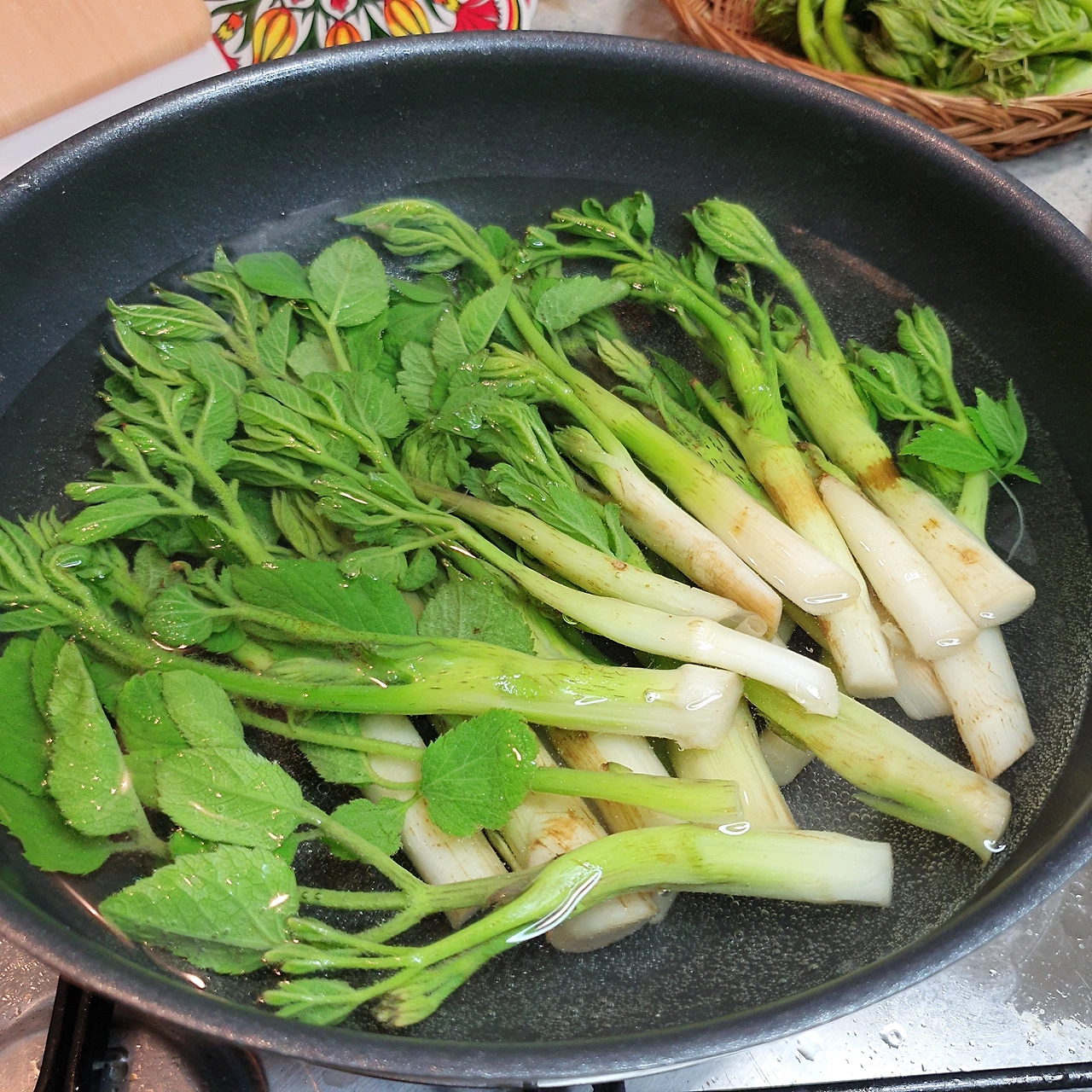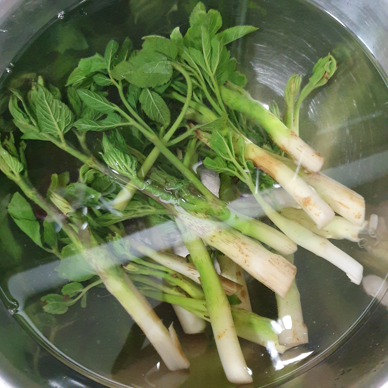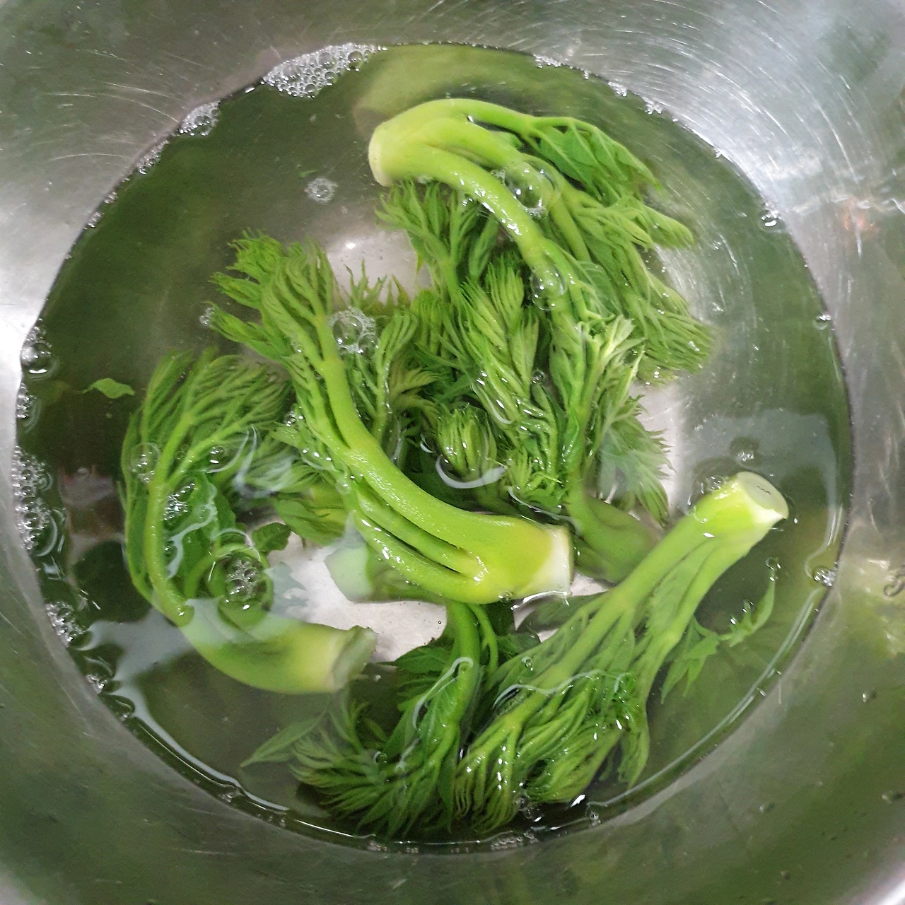 4. 푹 끓인 물에 두릅을 넣어주시고 푹 담 그어주세요