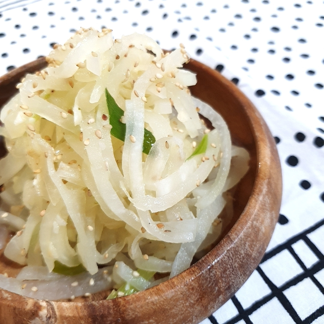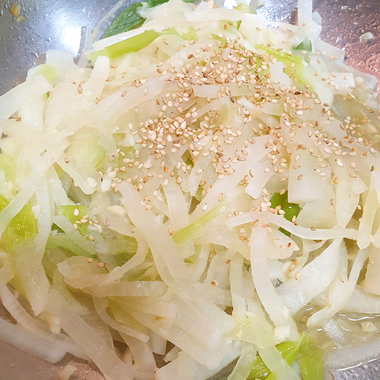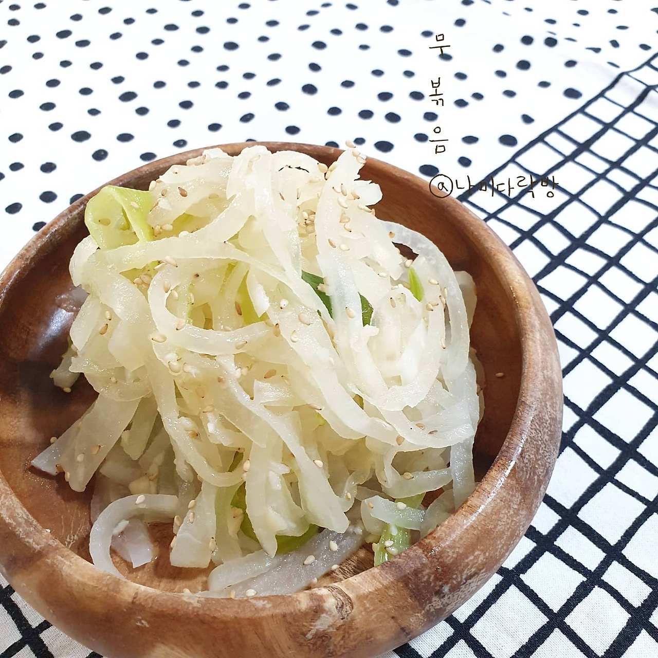<무나물 만들기>재료 : 무 반쪽 대파 약간양념재료 : 맛소금 1 작은 스푼 마늘 1스푼 들기름 3스푼 깨 1스푼