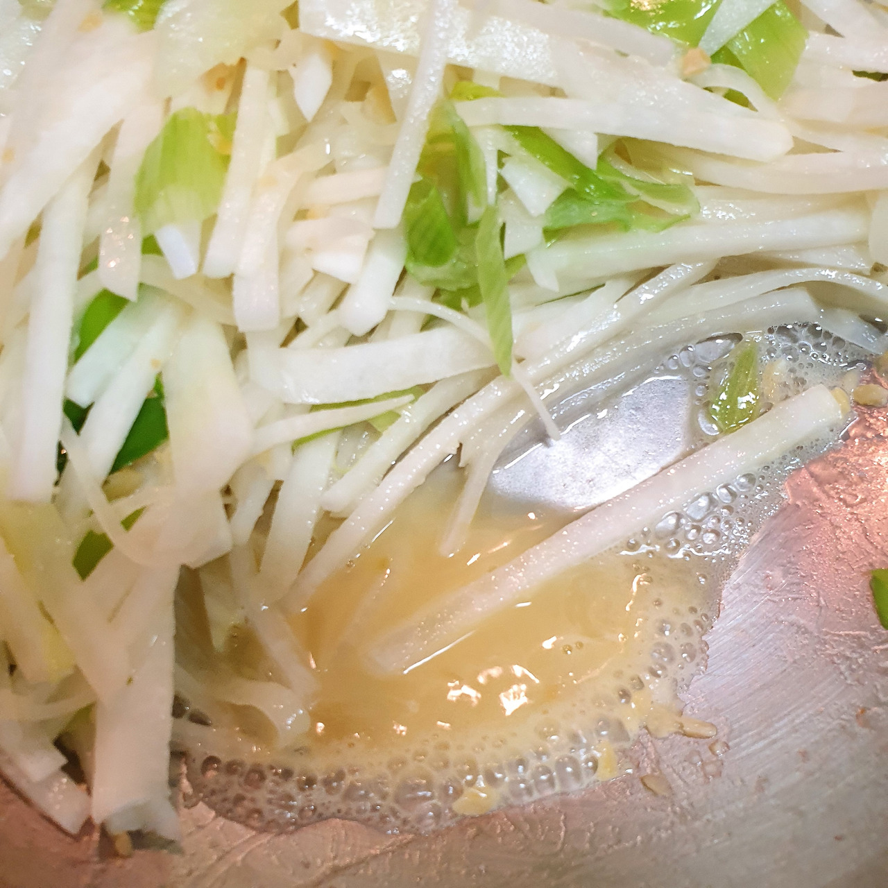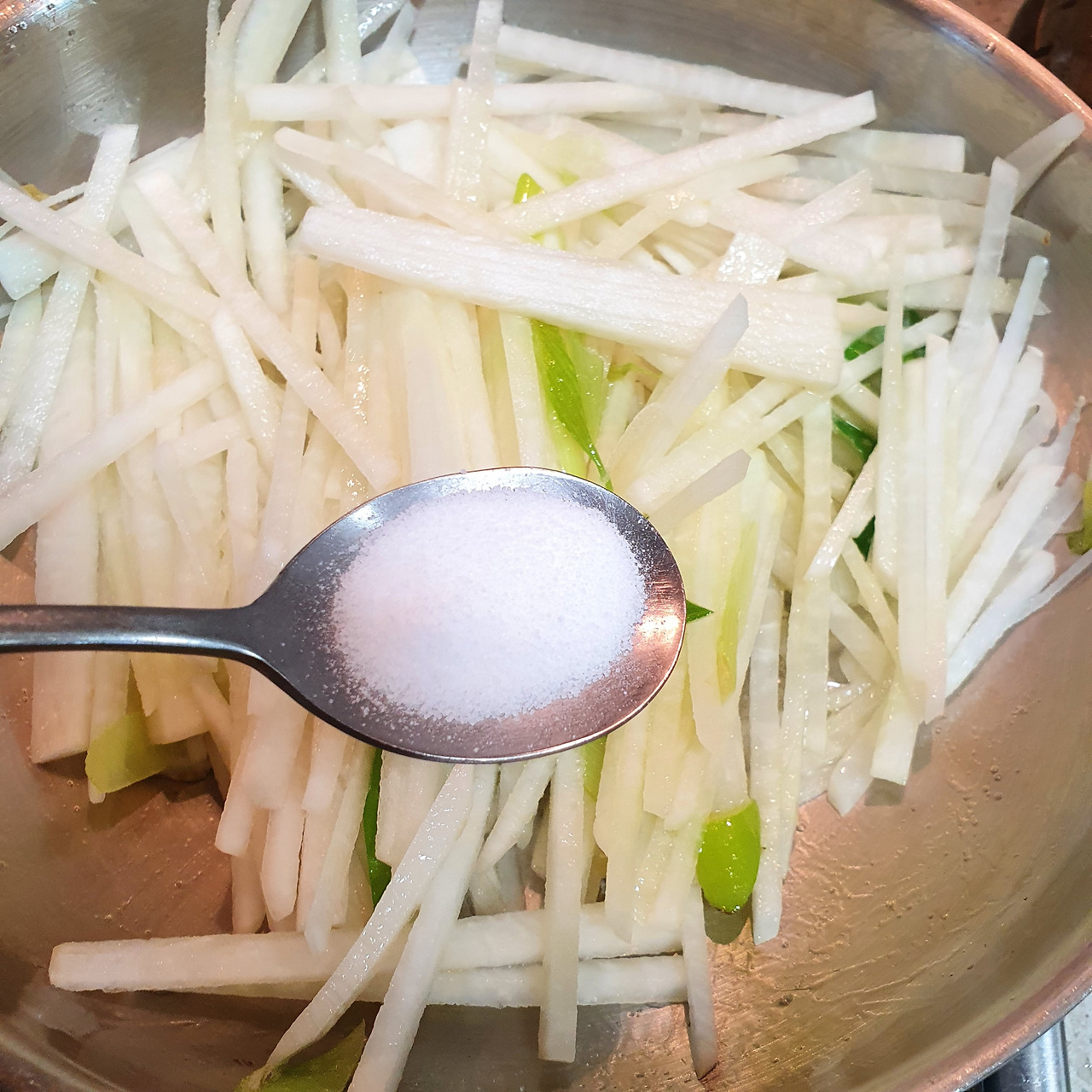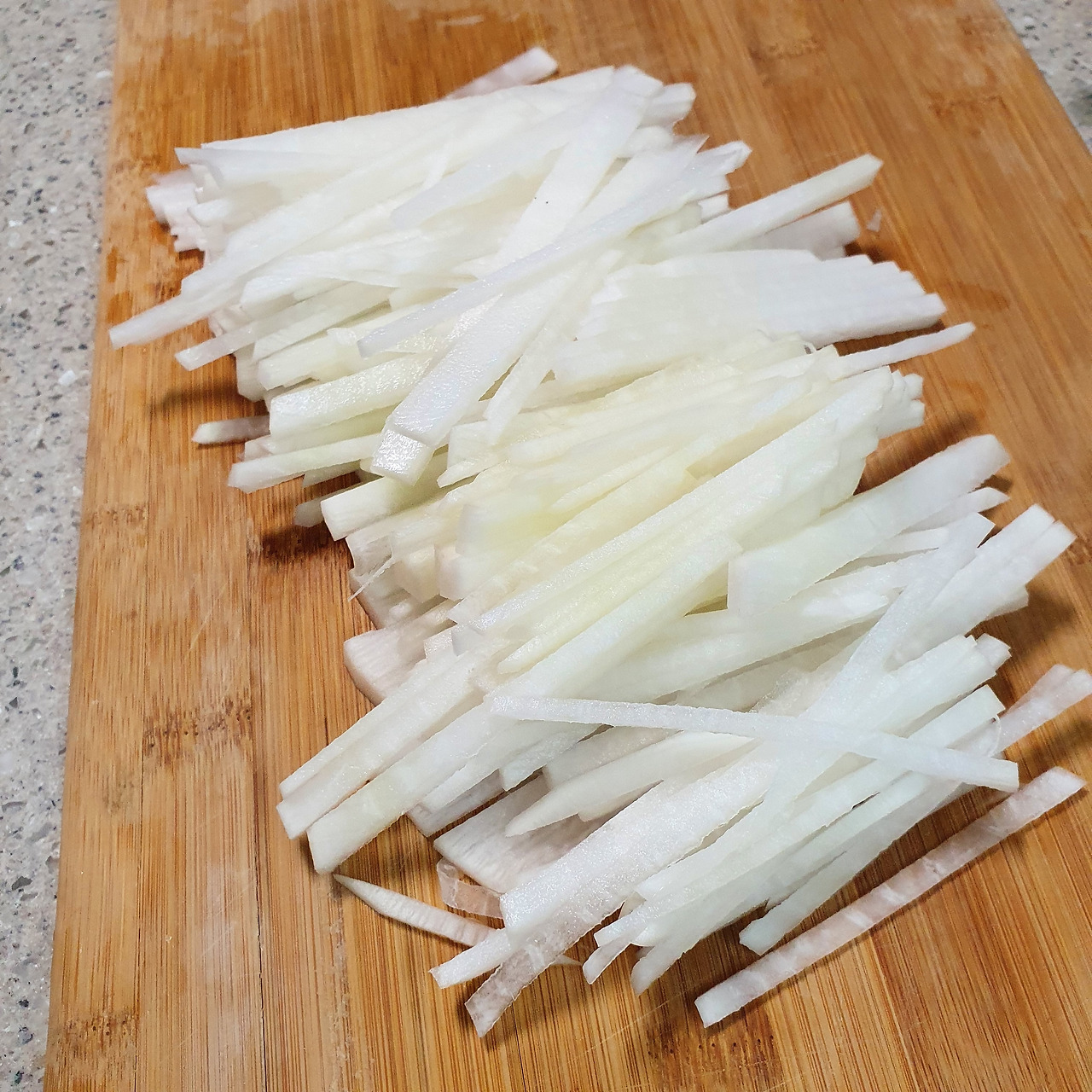 <무나물 만들기>재료 : 무 반쪽 대파 약간양념재료 : 맛소금 1 작은 스푼 마늘 1스푼 들기름 3스푼 깨 1스푼