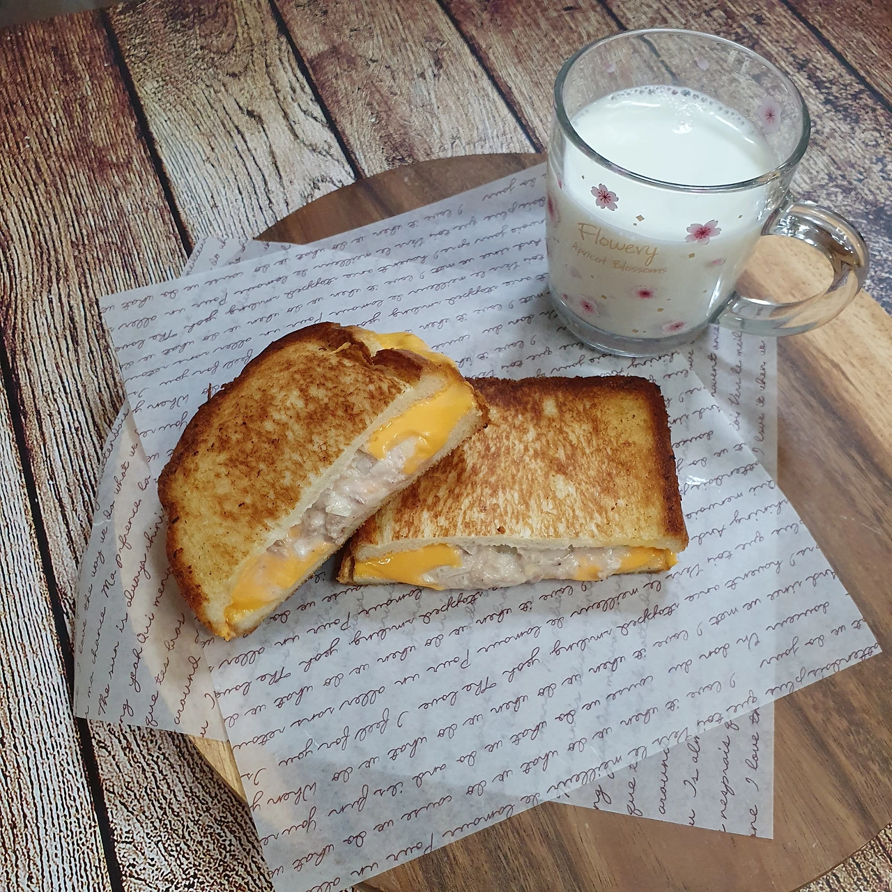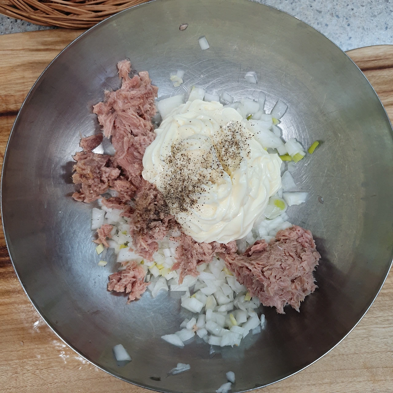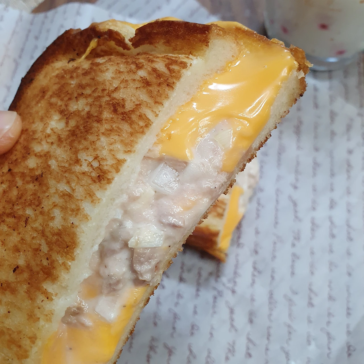 참치 멜트 토스트재료 : 참 치한 캔 치즈 3장 버터 식빵 2장 마요네즈 5스푼 양파 반쪽 후추 솔솔 맛소금 솔솔