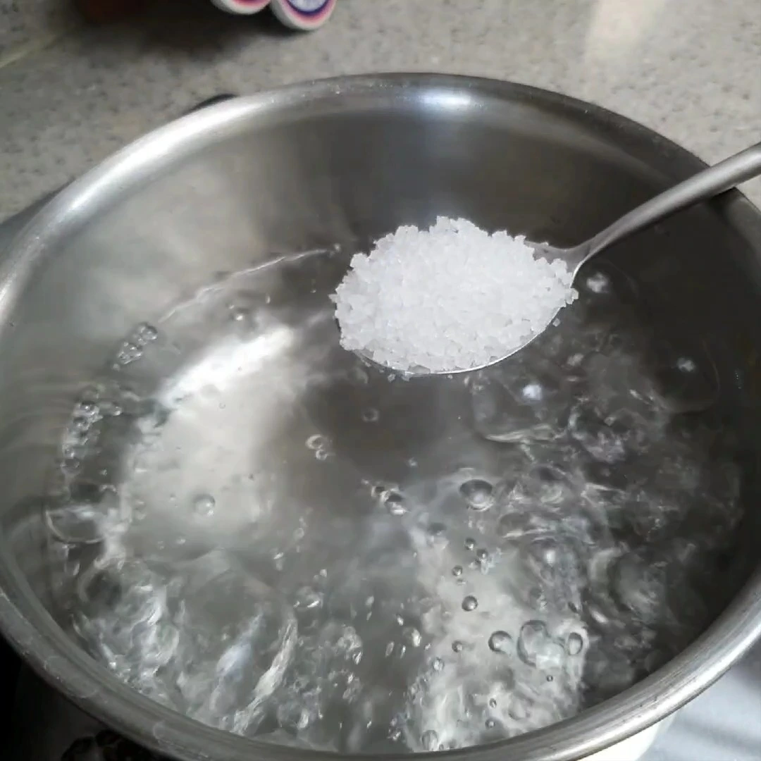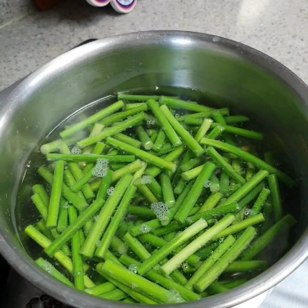 5. 물에 소금 1스푼을 넣고 펄펄 끓어진 물에 마늘종을 넣어 가스불을 끄고 10초만 세어주세요