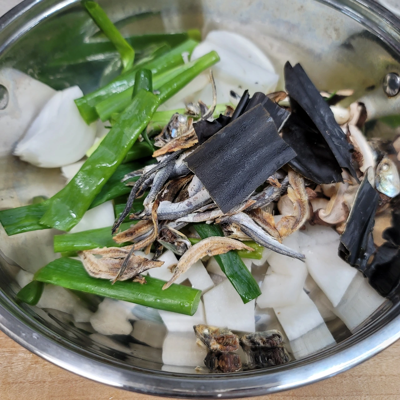 준비해주세요 재료 : 어묵한봉치 멸치 표고버섯 무 대파 양파 고추씨 다시마간할 때 : 국간장 마늘<어른 수저 종이컵 기준입니다.>