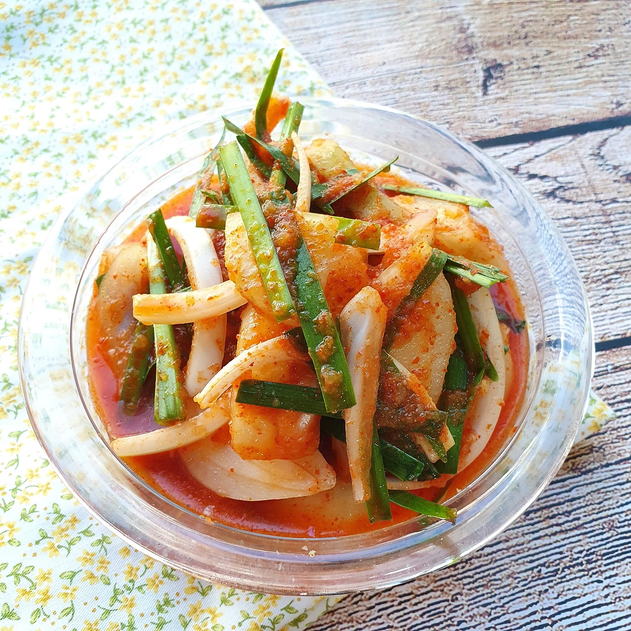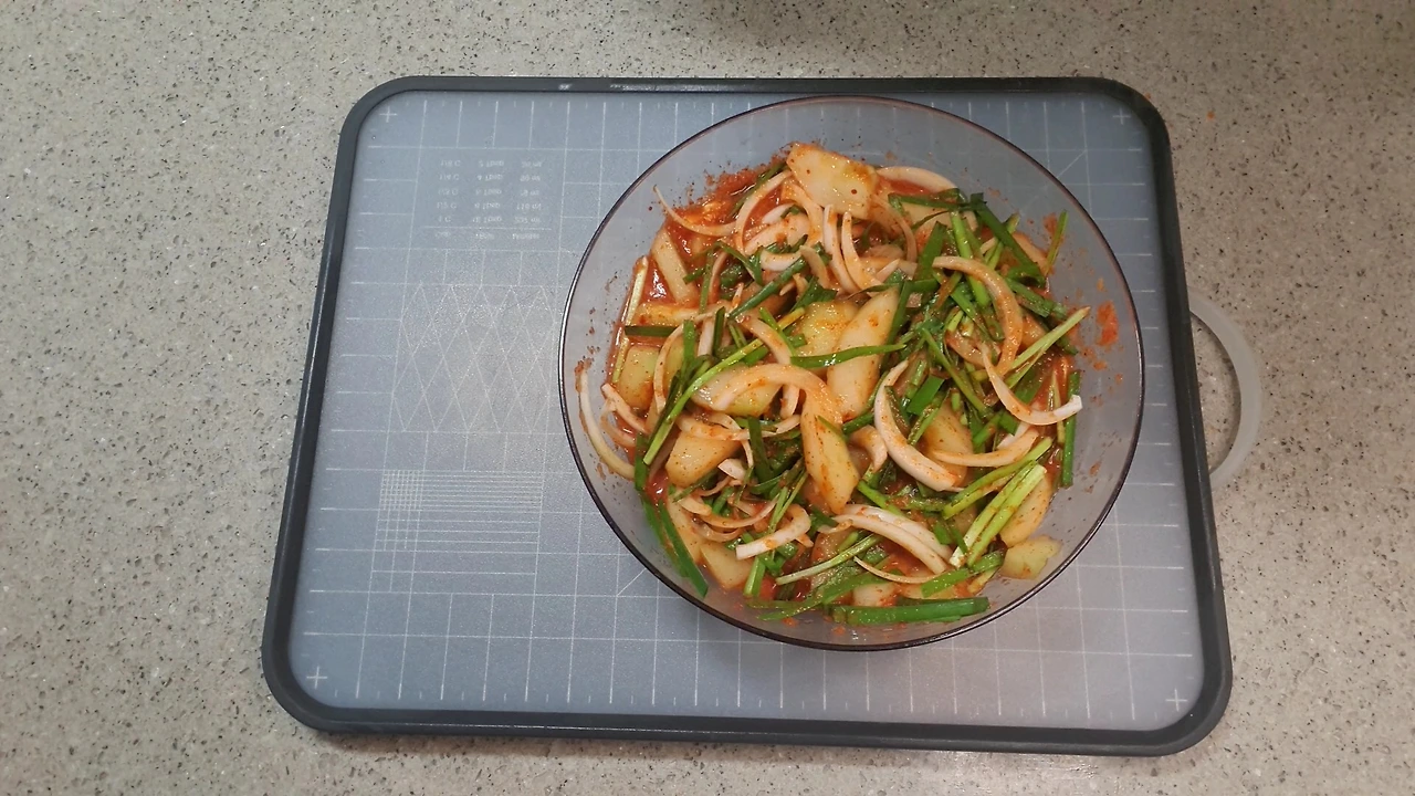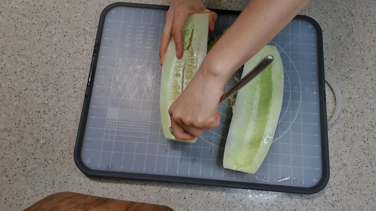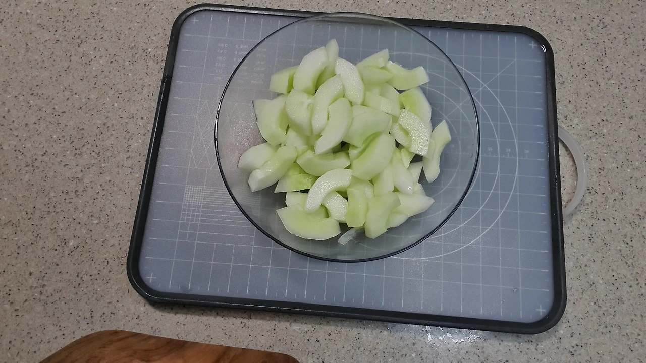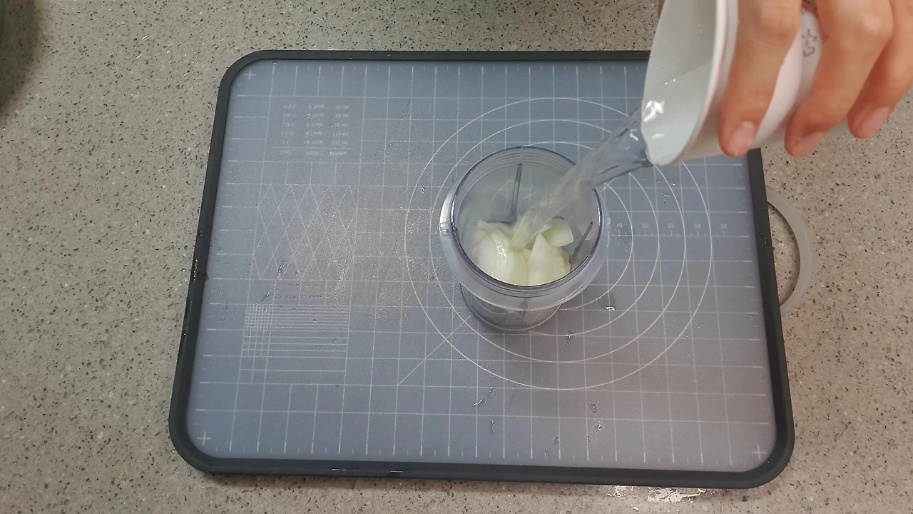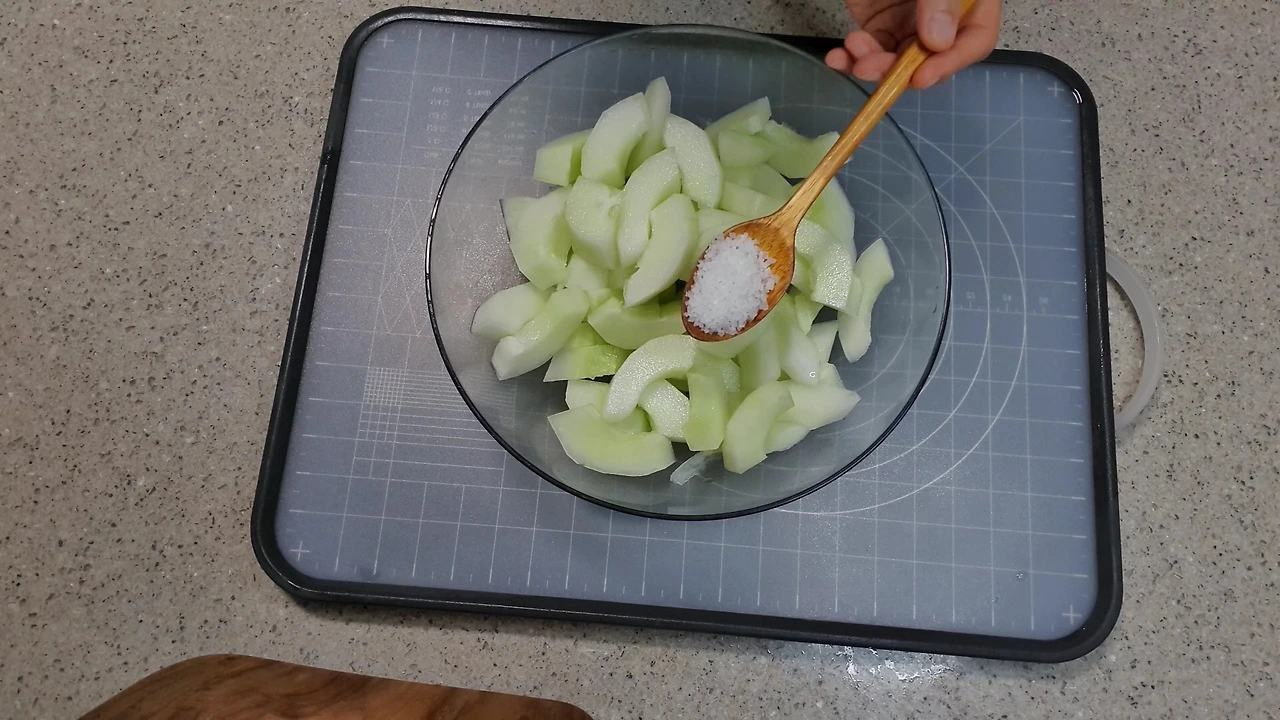 재료 준비해주세요 재료 : 노각 <소금 1스푼 절일 때> 양파 부추양념장 만들기 : 양파 반쪽 물 반 컵 <양파를 믹서기에 갈겠습니다.>고춧가루 3스푼 액젓 2스푼 설탕 1스푼 매실청 2스푼 생강 3조각 <어른 수저 및 종이컵 기준입니다.>