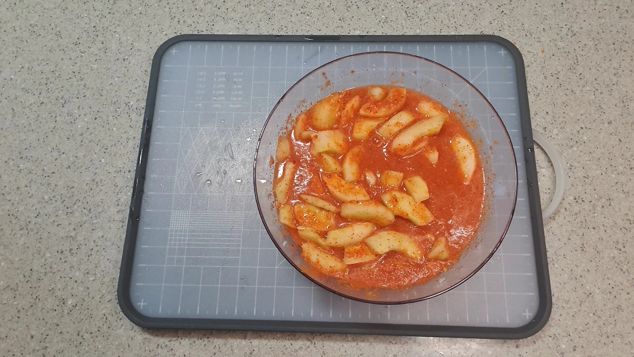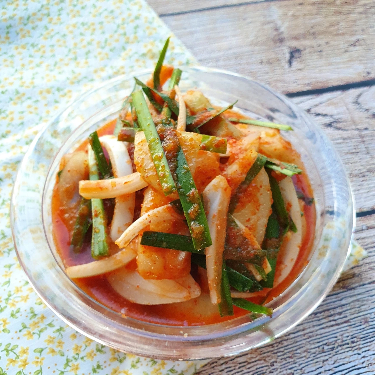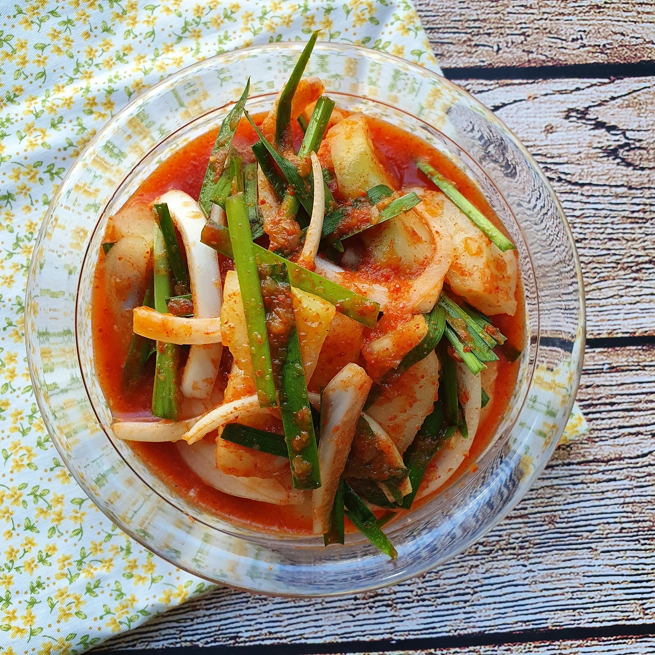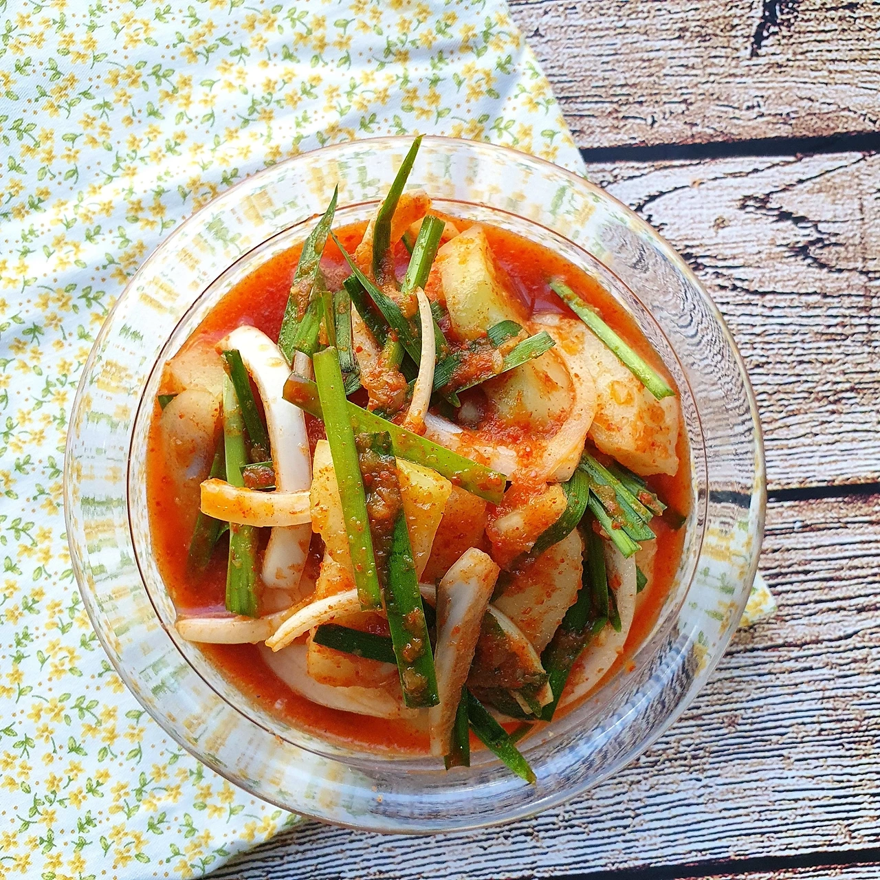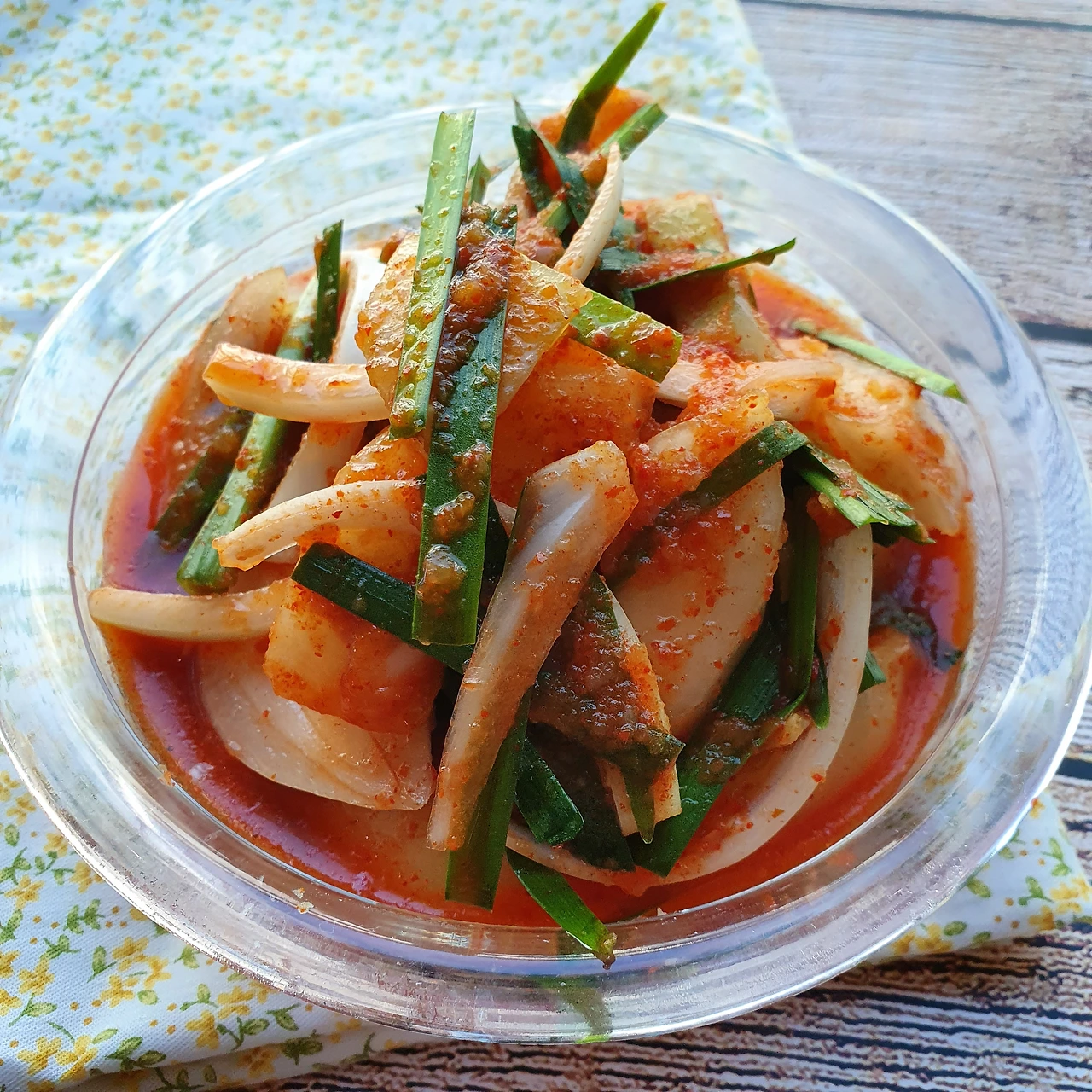 재료 준비해주세요 재료 : 노각 <소금 1스푼 절일 때> 양파 부추양념장 만들기 : 양파 반쪽 물 반 컵 <양파를 믹서기에 갈겠습니다.>고춧가루 3스푼 액젓 2스푼 설탕 1스푼 매실청 2스푼 생강 3조각 <어른 수저 및 종이컵 기준입니다.>