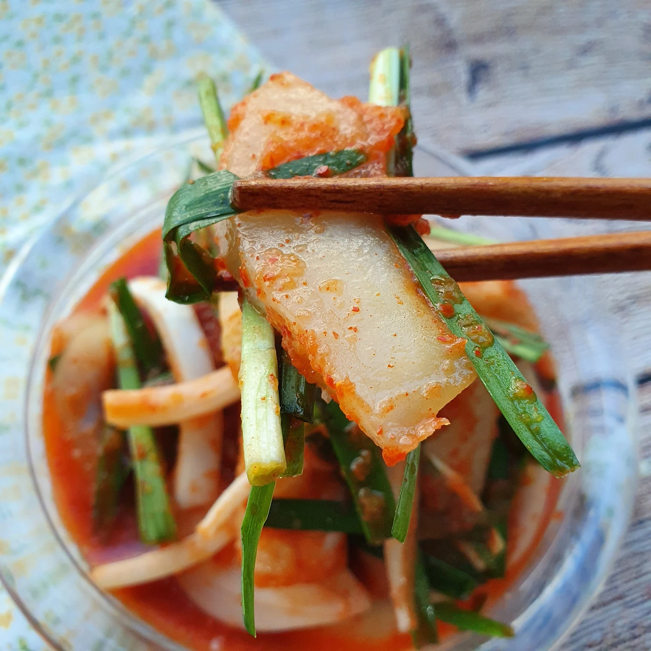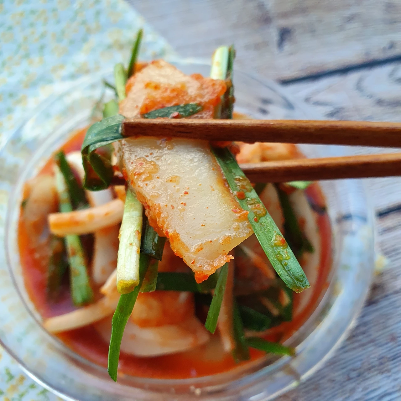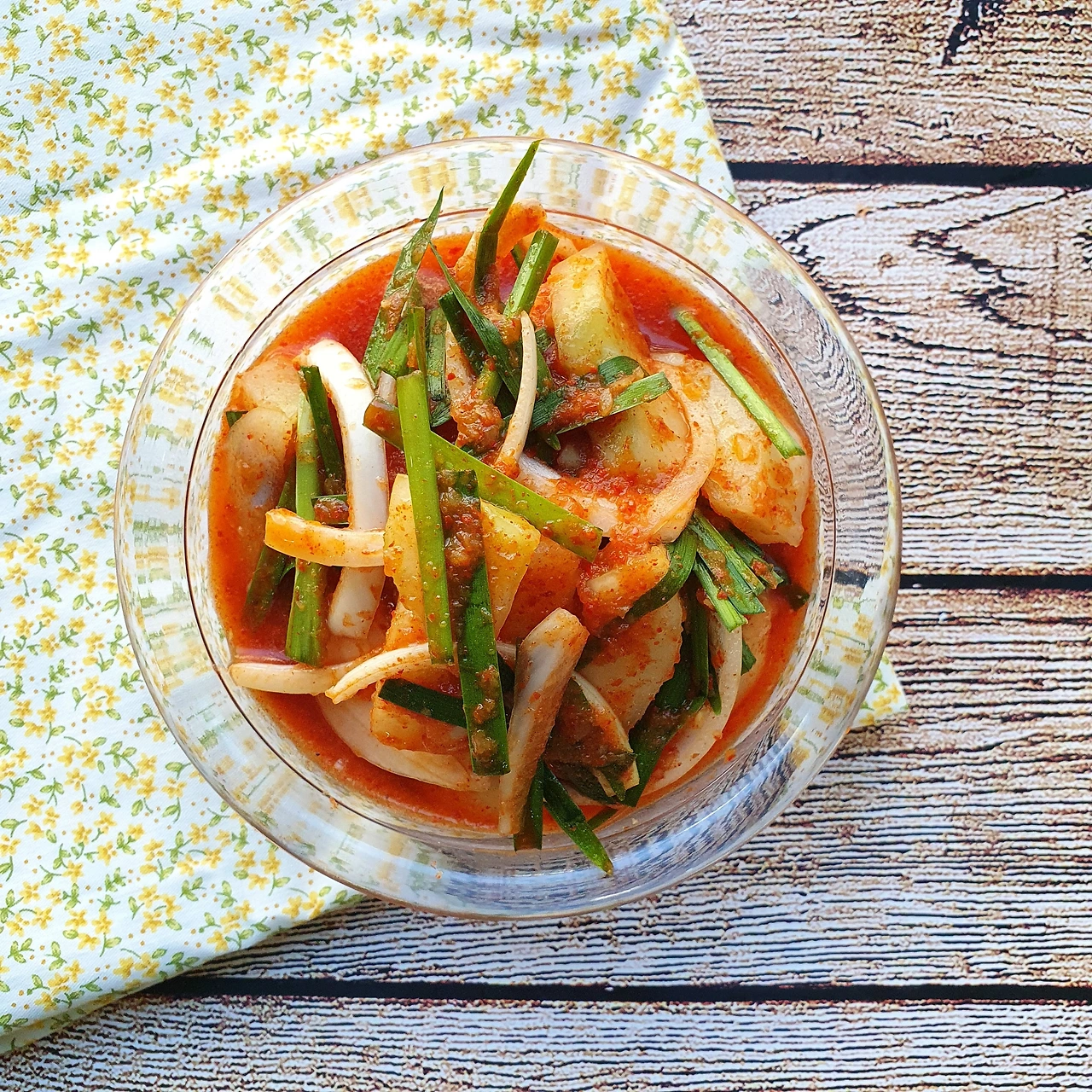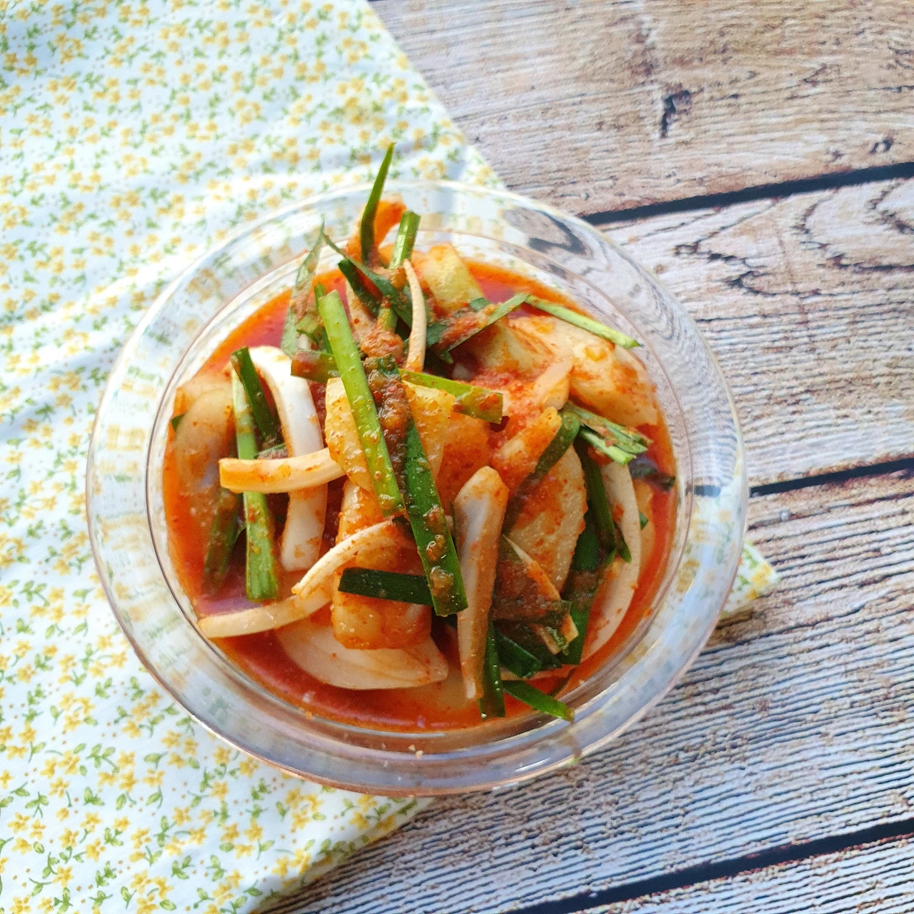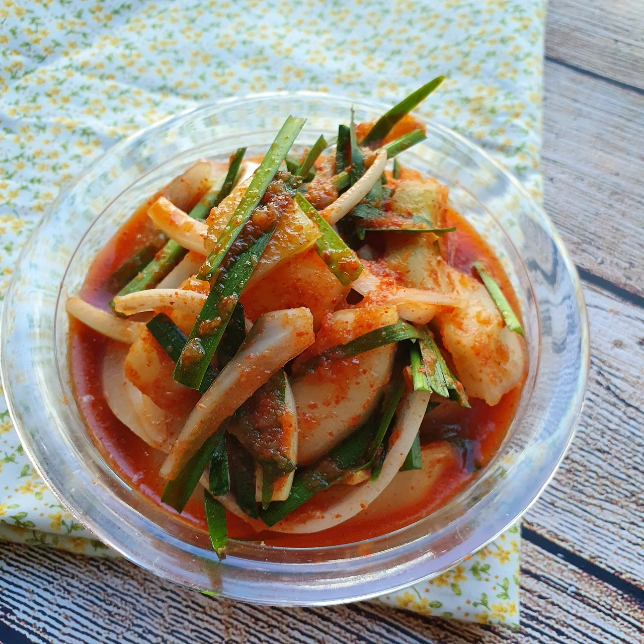 재료 준비해주세요 재료 : 노각 <소금 1스푼 절일 때> 양파 부추양념장 만들기 : 양파 반쪽 물 반 컵 <양파를 믹서기에 갈겠습니다.>고춧가루 3스푼 액젓 2스푼 설탕 1스푼 매실청 2스푼 생강 3조각 <어른 수저 및 종이컵 기준입니다.>