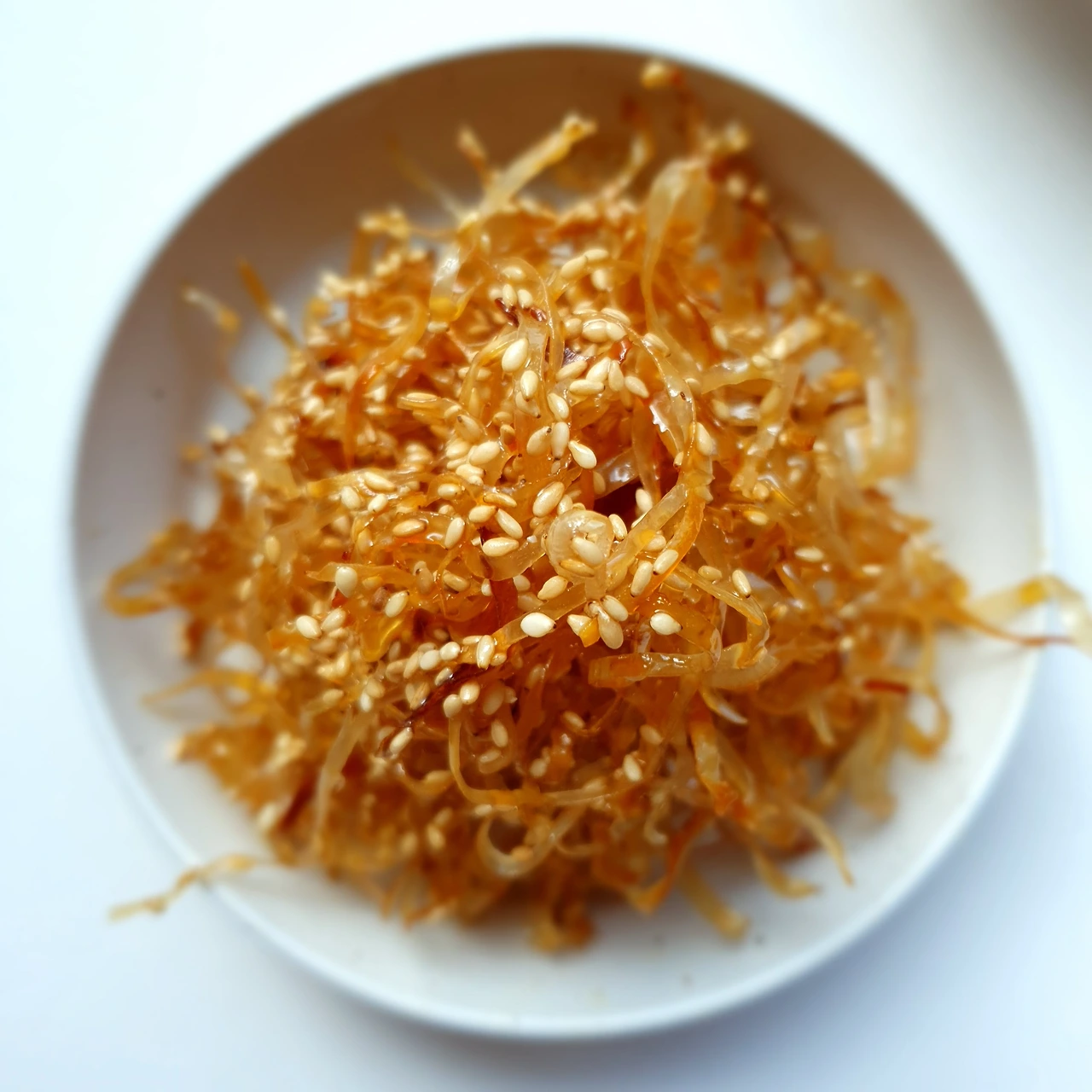 이제 잔열로 볶아주시면 딱딱하지 않은 오징어 실채가 되어요