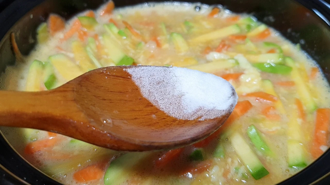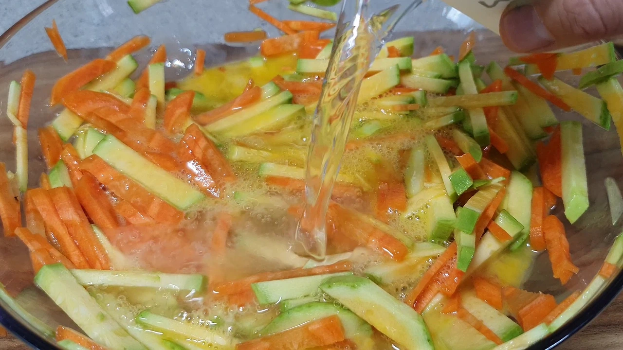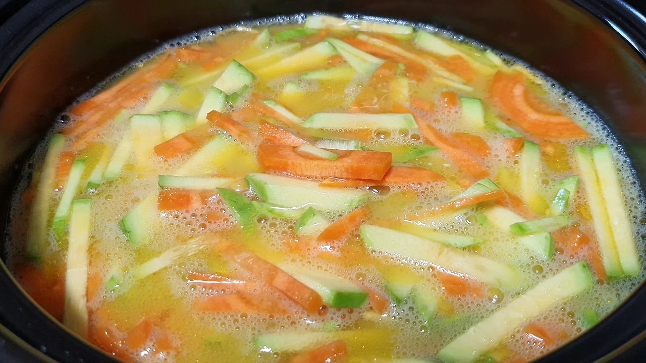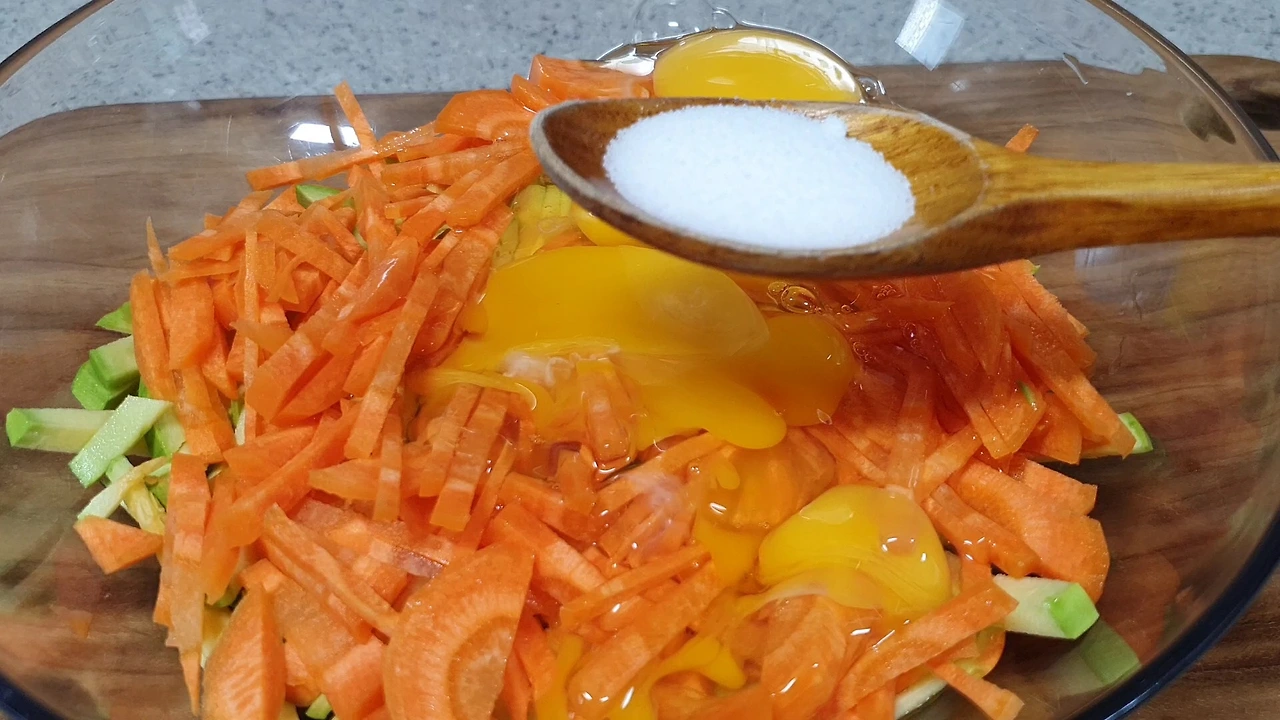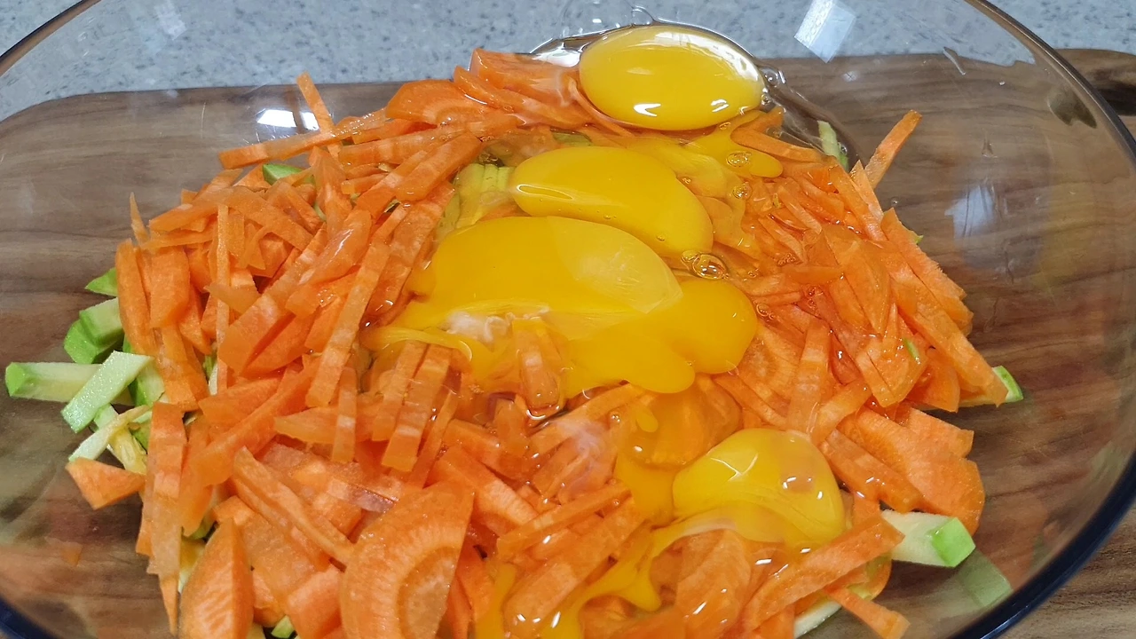 재료 : 계란 5알 호박 당근양념재료 : 물 1컵 맛소금 1스푼들기름 2스푼 식소다 약간