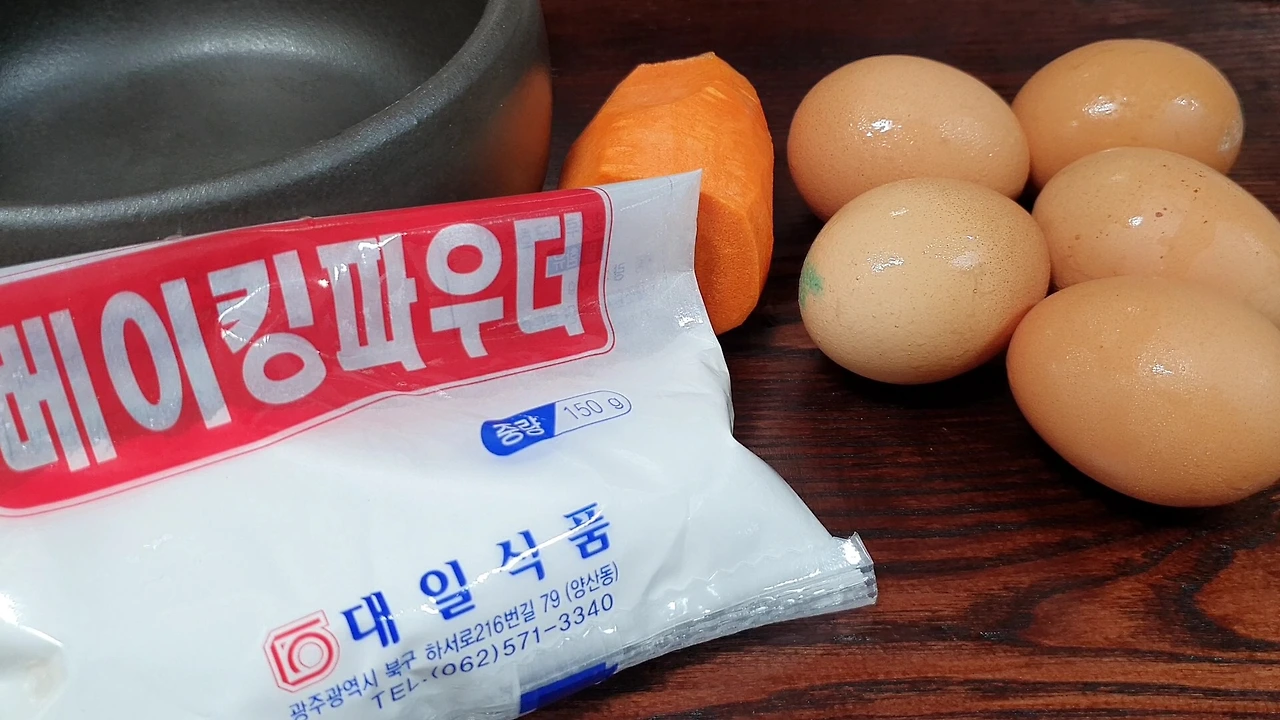 재료 : 계란 5알 당근양념재료 : 베이킹파우더 작은1스푼 물1컵 들기름1스푼 맛소금작은1스푼<어른수저 및 종이컵기준입니다>