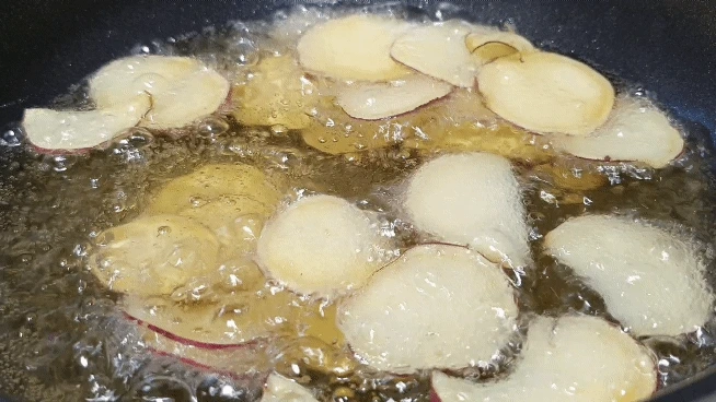 7. 얇게 채 썬 고구마를 먼저 튀겨주세요. 노릇노릇하게 튀겨주세요