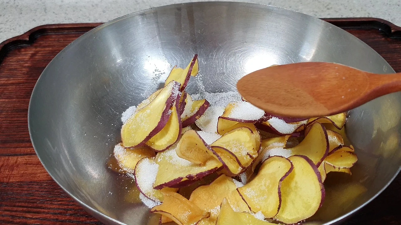 기름과 설탕의 만남으로 손으로 만져도 묻지 않는 고구마 빠스 고구마맛탕이예요